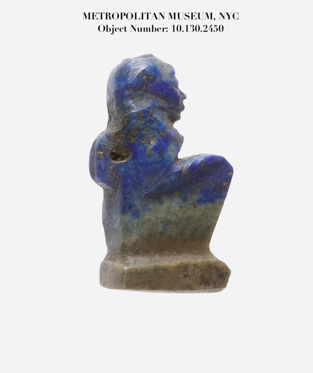 This amulet represents the goddess Ma’at, deity of Truth and Justice, embodying the balance of the universe. She is shown here in her typical posture, seated on the ground with her knees drawn up. Egyptian dignitaries were sometimes depicted wearing small figures of Ma’at around their necks to signify that their conduct was righteous.