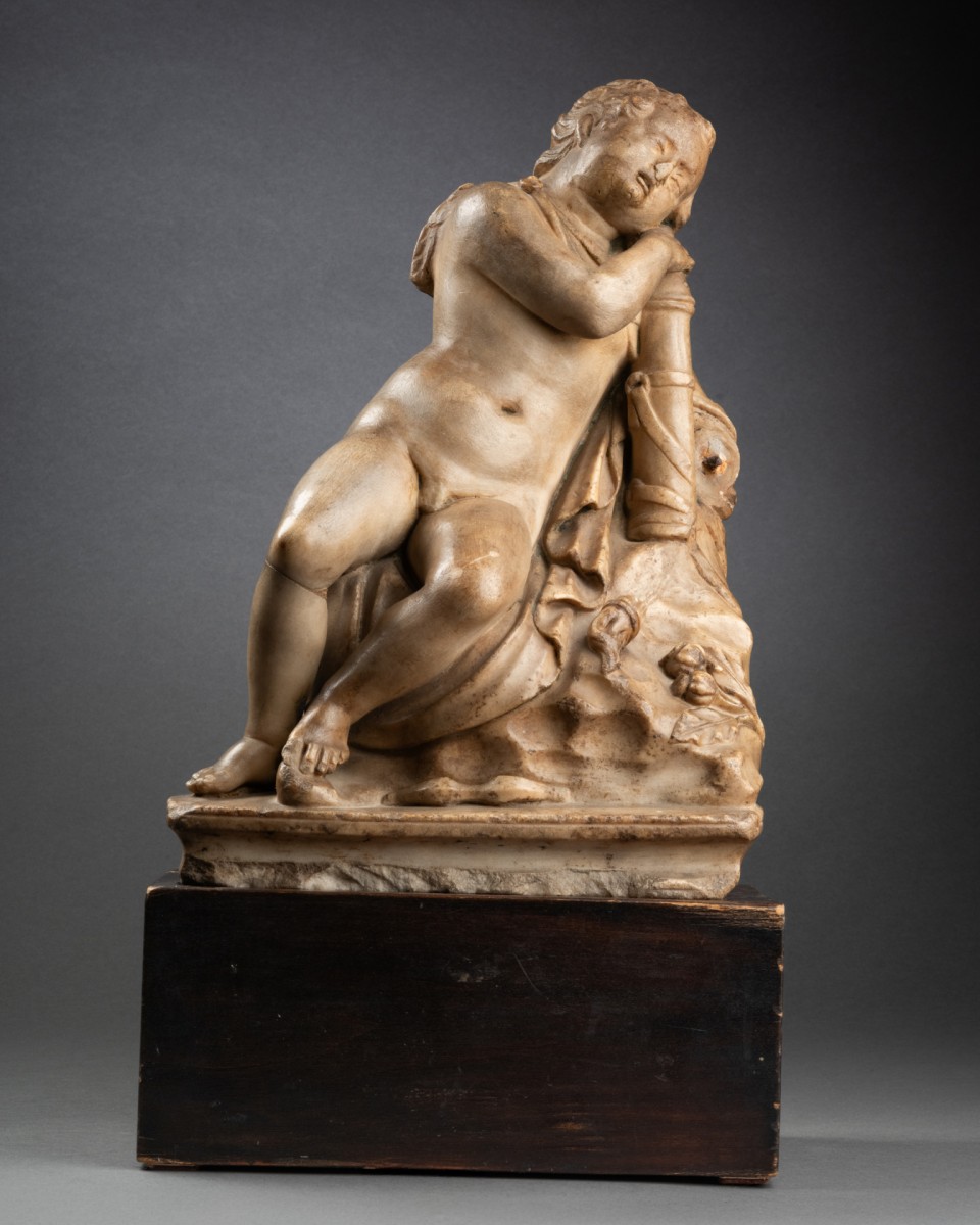 Sculptures such as this small-scale Eros, executed with great refinement, perfectly reflect the taste of the Estense and Medici courts for precious, collectible works destined for the studiolo or private cabinet. The collection of Isabella d’Este (1474–1539), a preeminent patron of the arts and wife of Francesco II Gonzaga, Marquis of Mantua (1466–1519), included among its most celebrated pieces two Sleeping Cupids: one an antique attributed to Praxiteles, the other by Michelangelo. Two additional examples, recorded in the Gonzaga family inventories in the early seventeenth century, later joined the collection; of these four works, three were sold to King Charles I of England in 1631. Such sculptures allowed collectors to celebrate both the legacy of antiquity and the virtuosity of contemporary artists, while the theme of the sleeping god also found literary echoes in sixteenth-century Italian poetry, where it symbolized the sweetness and peril of love.