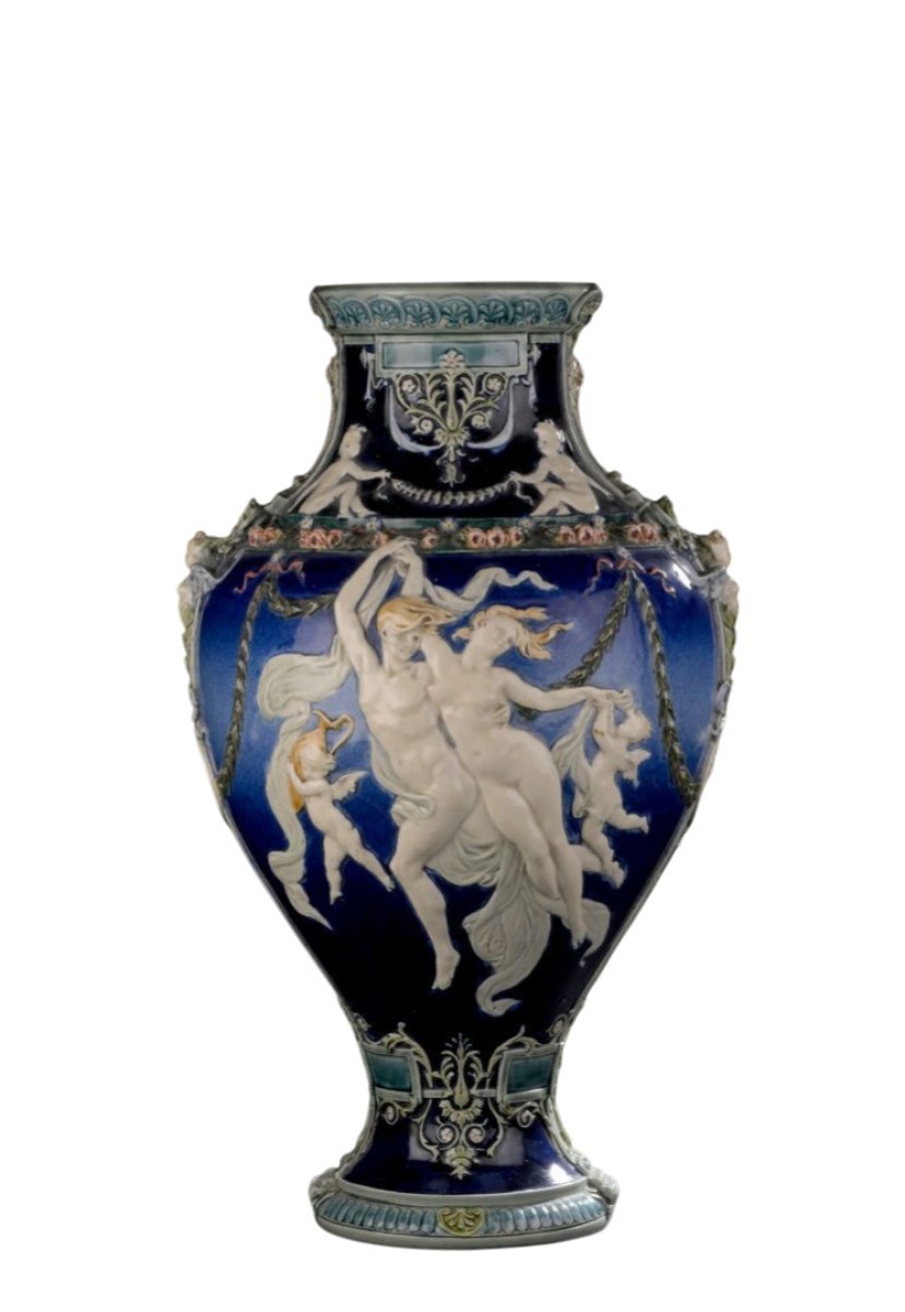 Elegant baluster-shaped vase in fine earthenware, richly decorated in polychrome relief. Against a deep blue background unfolds an allegorical scene depicting Night carried away by Day, where draped female figures are lifted by winged cupids amid garlands of flowers, foliage, palmettes, and scrolling motifs.