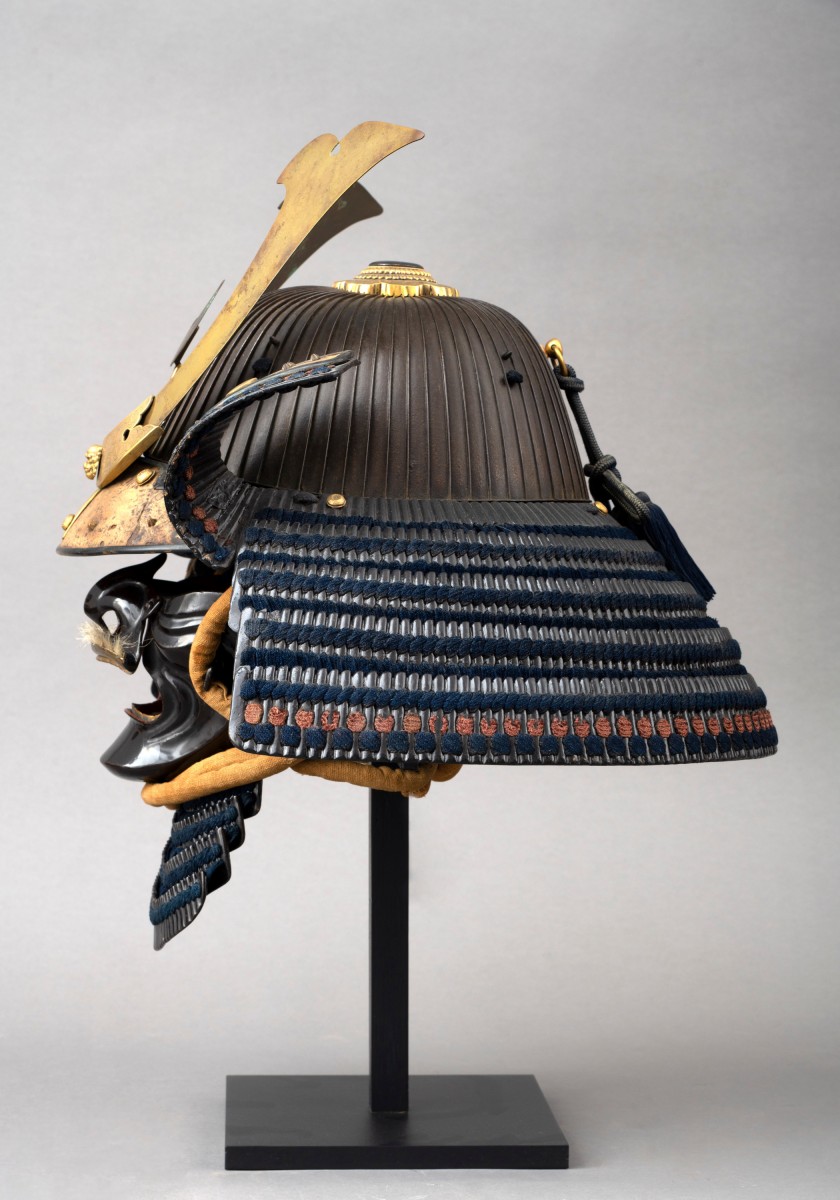 Shikoro, manju-style neck cover in lacquered iron in kiritsuke zane, laced with navy blue kebiki