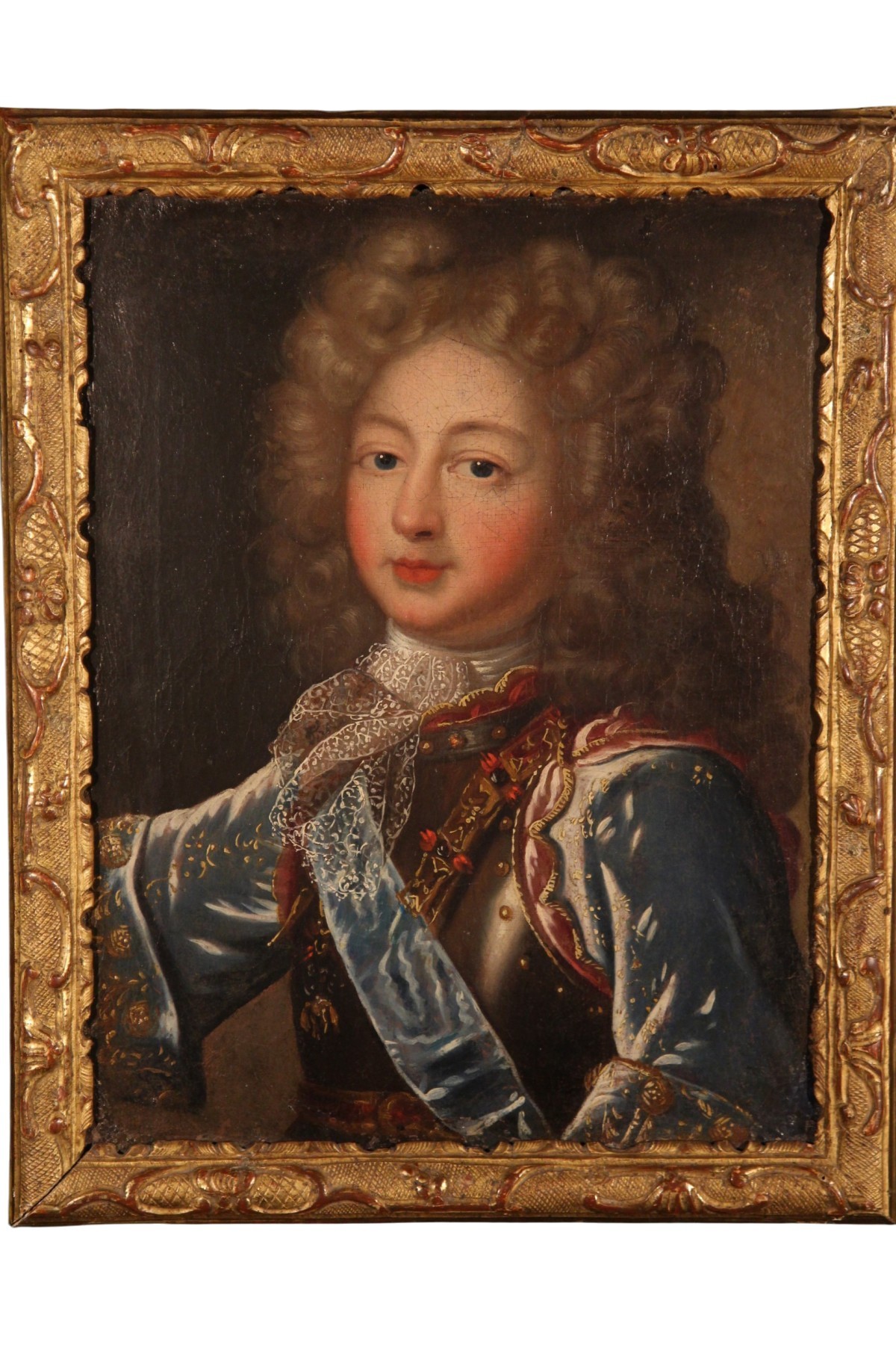 Oil on canvas. French school of the 17th century. Young man in armour. Period frame in carved and gilded wood with a Berain decoration. dimensions canvas 16,14 ” x 12,99 “ with frame 18,50 ” x 14,57 “