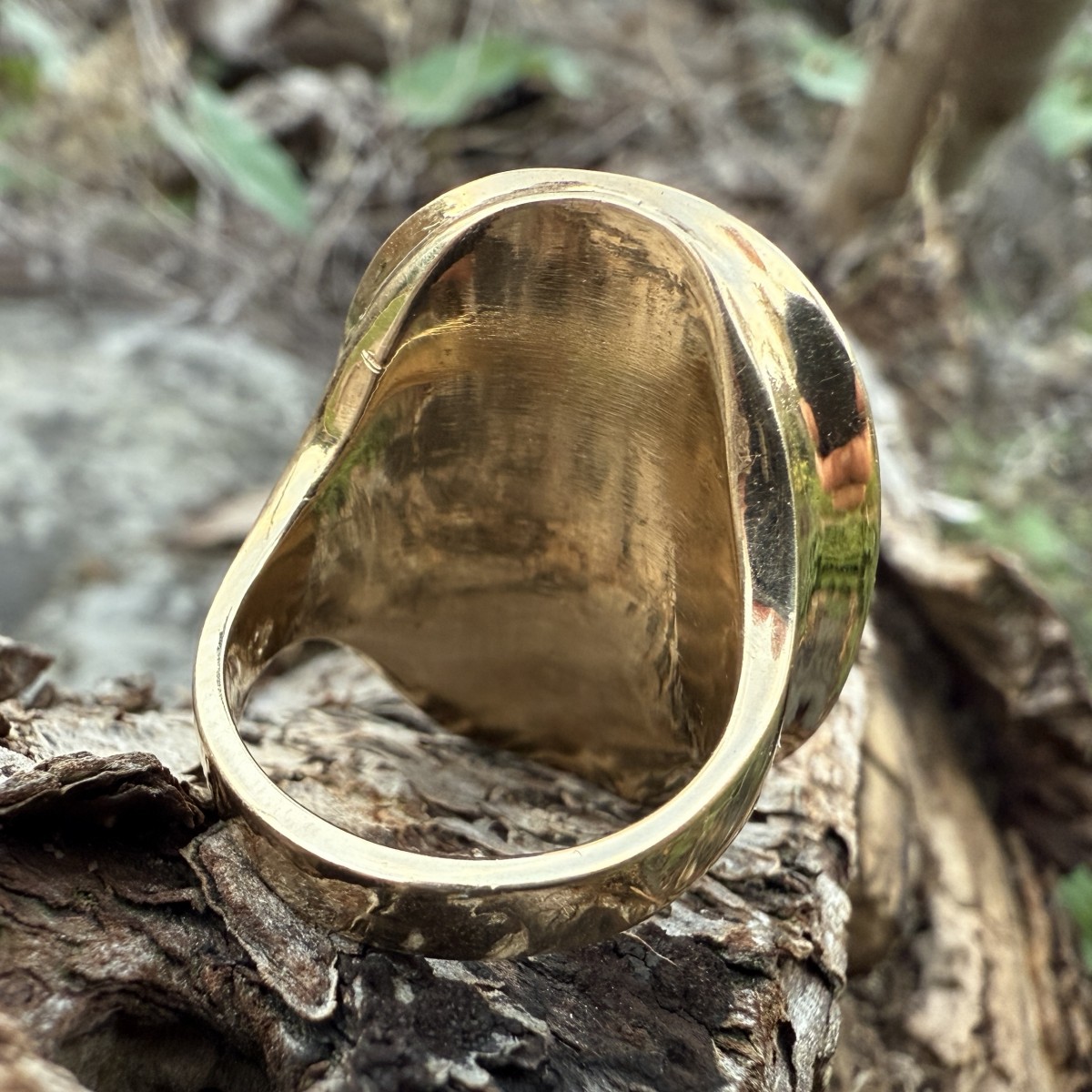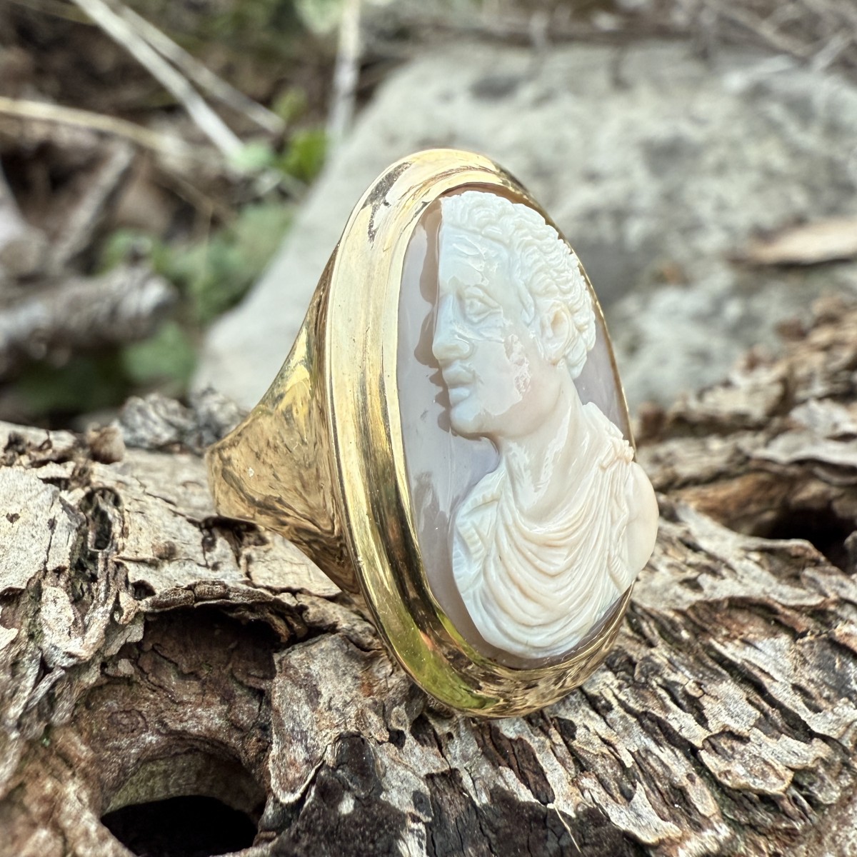 The cameo is set within a smooth, broad gold bezel of contemporary 20th-century manufacture, fashioned in solid 14 carat gold and struck ‘14K’ to the inner shank. The ring’s generous proportions and polished surface provide a dignified and harmonious setting for the antique gem.