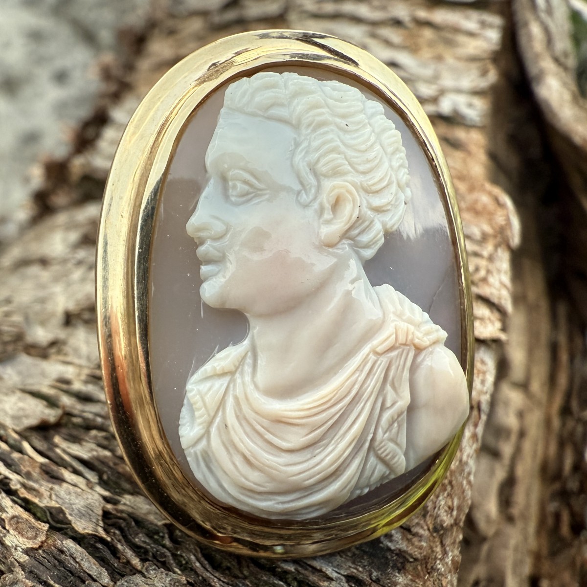 Carved in fine layered agate, the oval cameo portrays a Roman nobleman in profile to the left, possibly representing a Julio-Claudian prince. The sitter is shown wearing a draped chiton across his shoulder, his features idealised in the classical manner with neatly defined curls and a serene expression. The sculptural modelling of the face and garment folds exemplifies the refined classicism of Italian Renaissance gem-carving, which often revived imperial Roman portrait types in homage to antiquity.