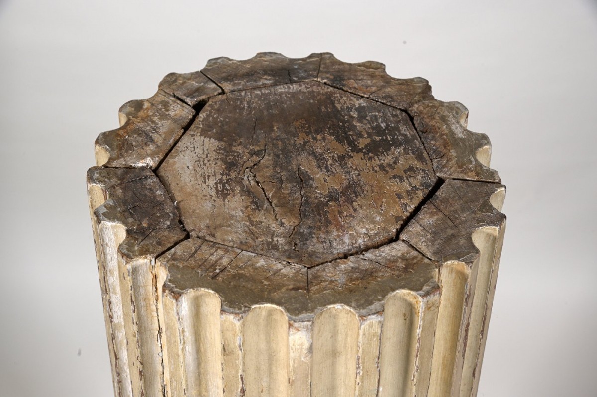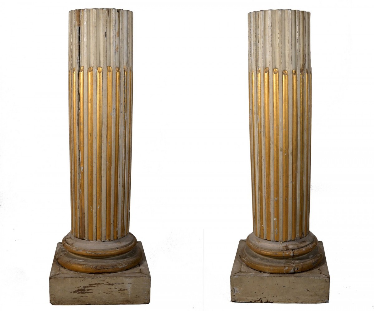 A pair of French painted and parcel gilt circular carved wood columns , on square bases, Louis XVI period, circa 1780.