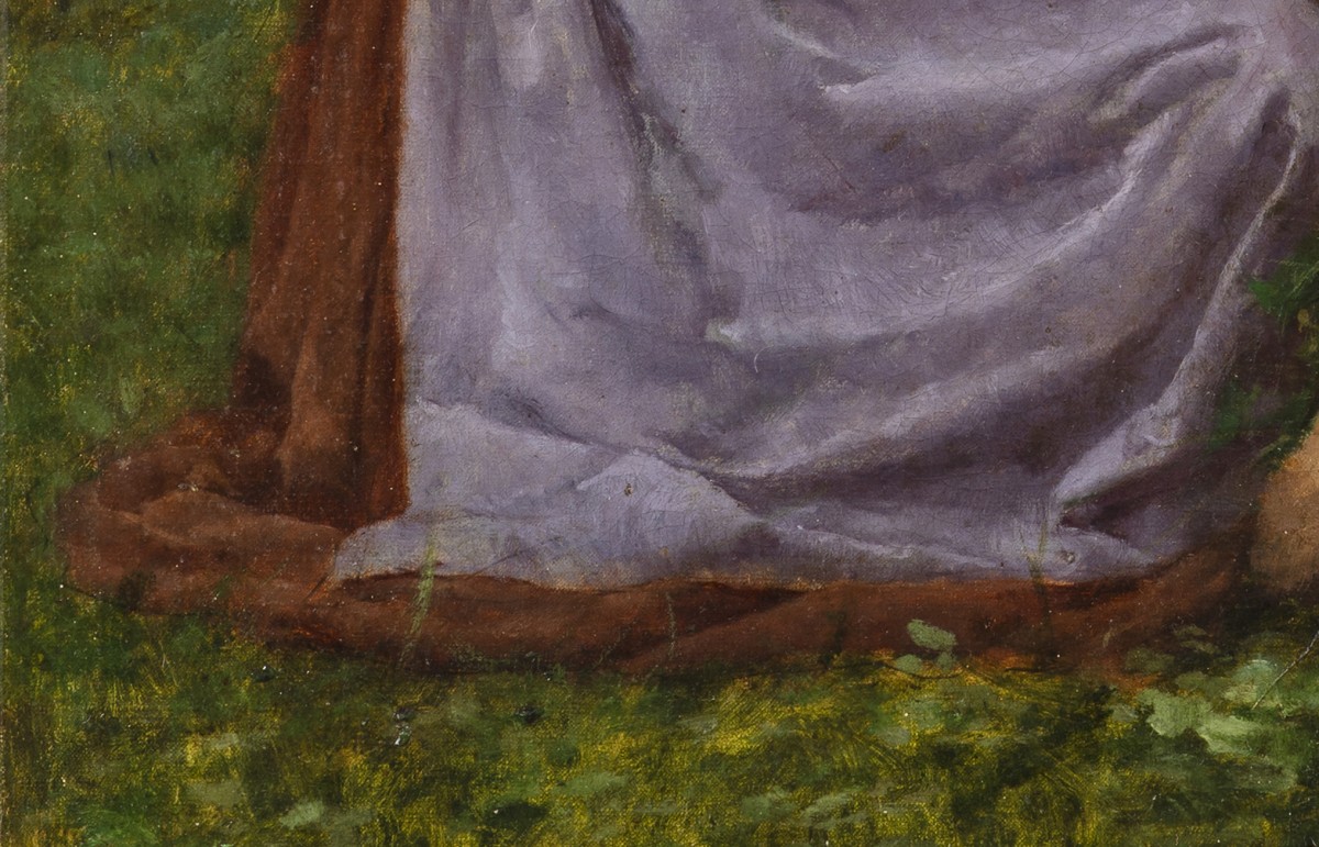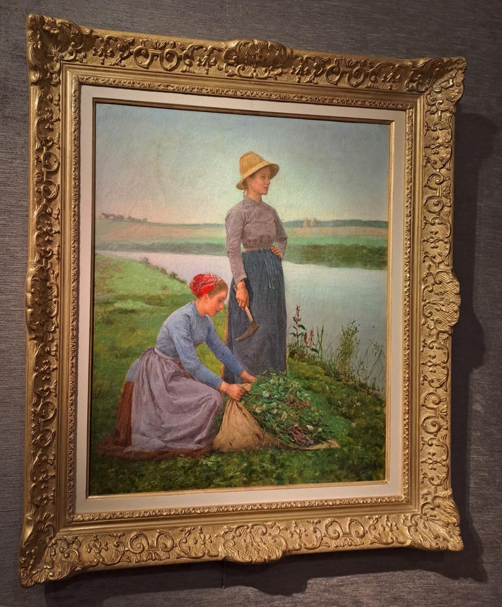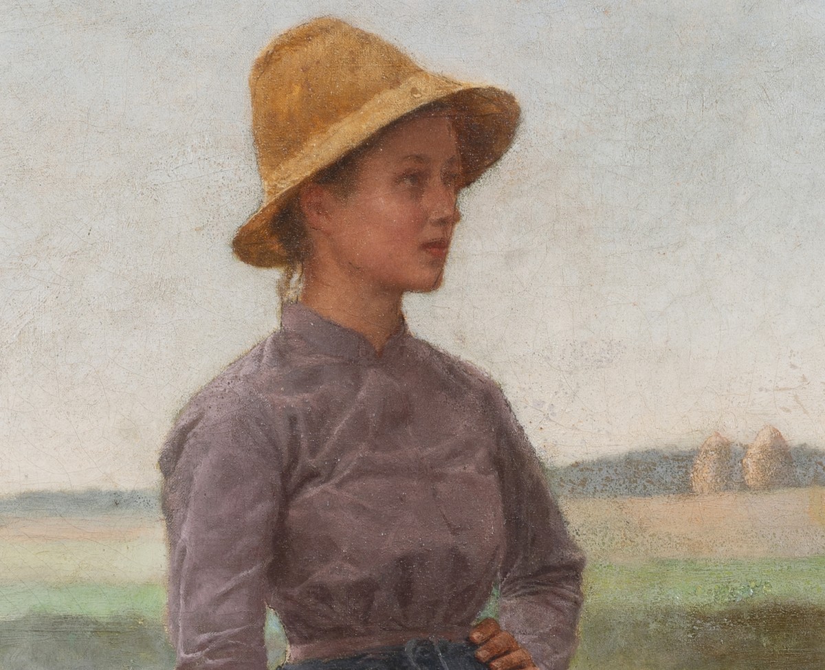Our work, created in 1887, is admirably well composed: the vanishing lines converge towards the point where the river disappears in a halo of light. This rural subject captures, almost like a photograph, a moment of life at the end of the 19th century. Parrot here paves the way for the painter Julien Dupré, a great specialist of the French countryside. In a suspended moment, the two young women with perfect faces seem lost in their thoughts. The drawing of the clothing and figures is precise, while that of the landscape fades, creating an almost unreal depth. This oil painting, on its original canvas, is housed in a gilded wood frame.