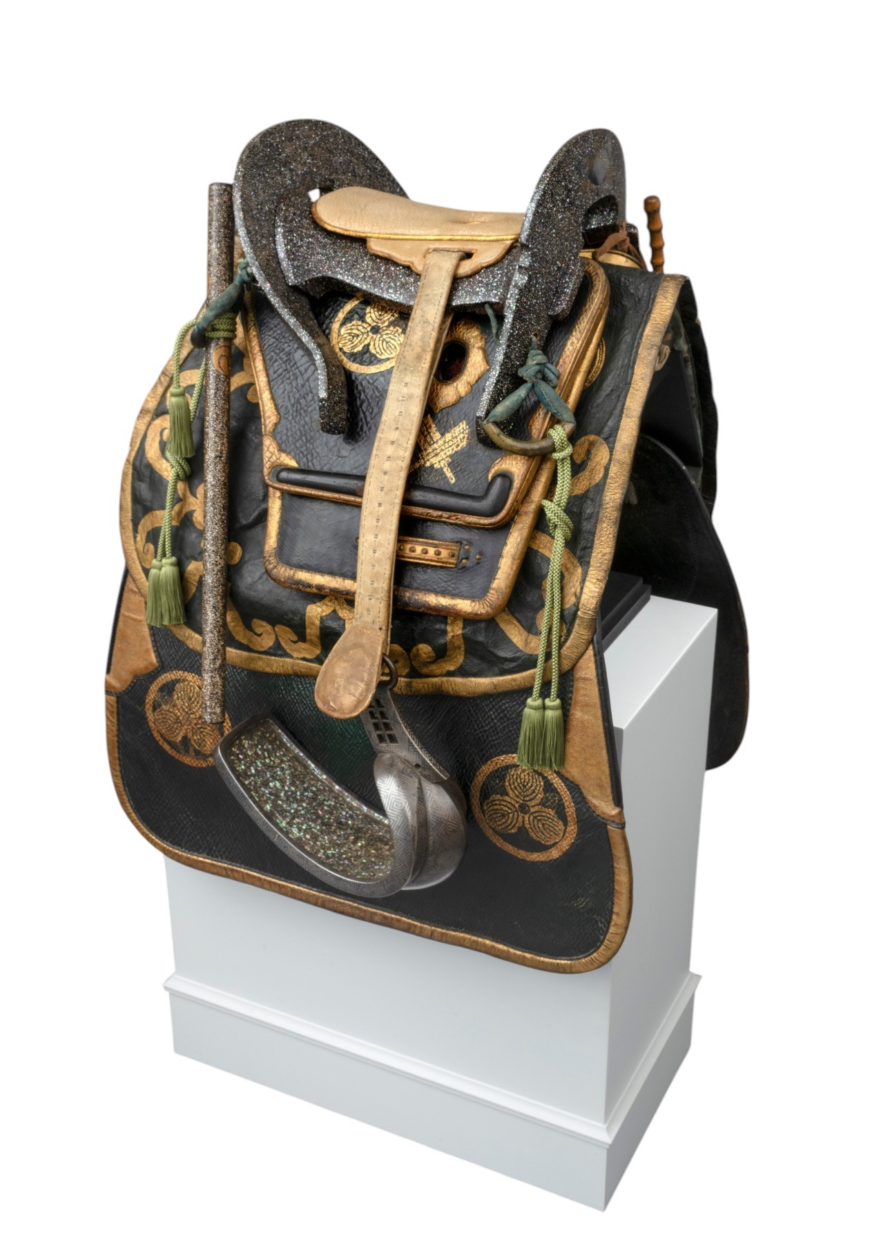 A rare Japanese wagura-style red oak (kashi) saddle from the Edo period (1603-1868), entirely decorated with mother-of-pearl spangles (raden aogai). The different parts are connected together by joints and cords allowing the kura bane to flex. It has four parts: the maewa (tree), the arched front plate, and the shizuwa (troussement), the arched back plate. These are connected by two igi (profiled side strips) that connect the maewa to the shizuwa. The igi rest on either side of the horse's spine and serve as a subframe for the leather assembly (basen or kura tsubo). The igi are split for the stirrup straps (chikara-gawa or gekiso).
