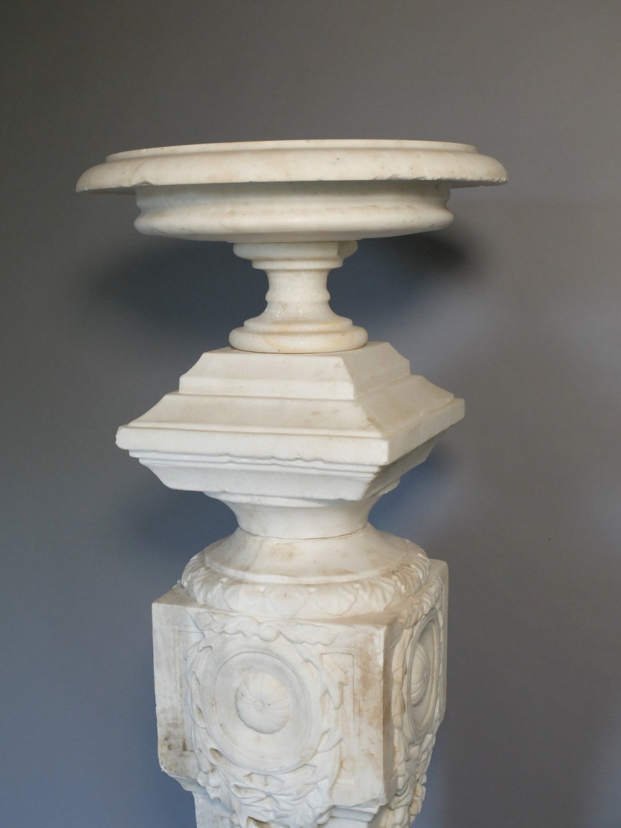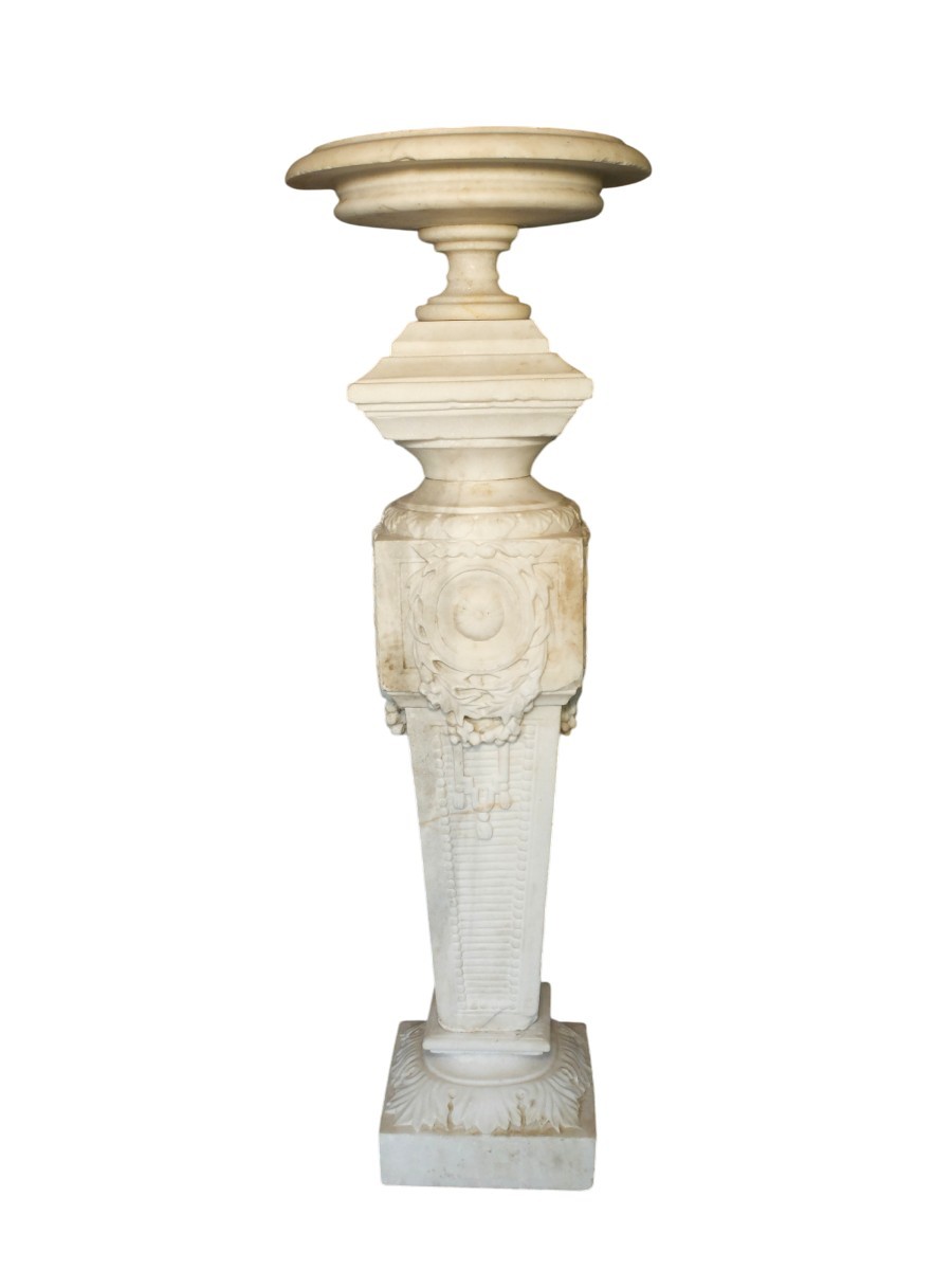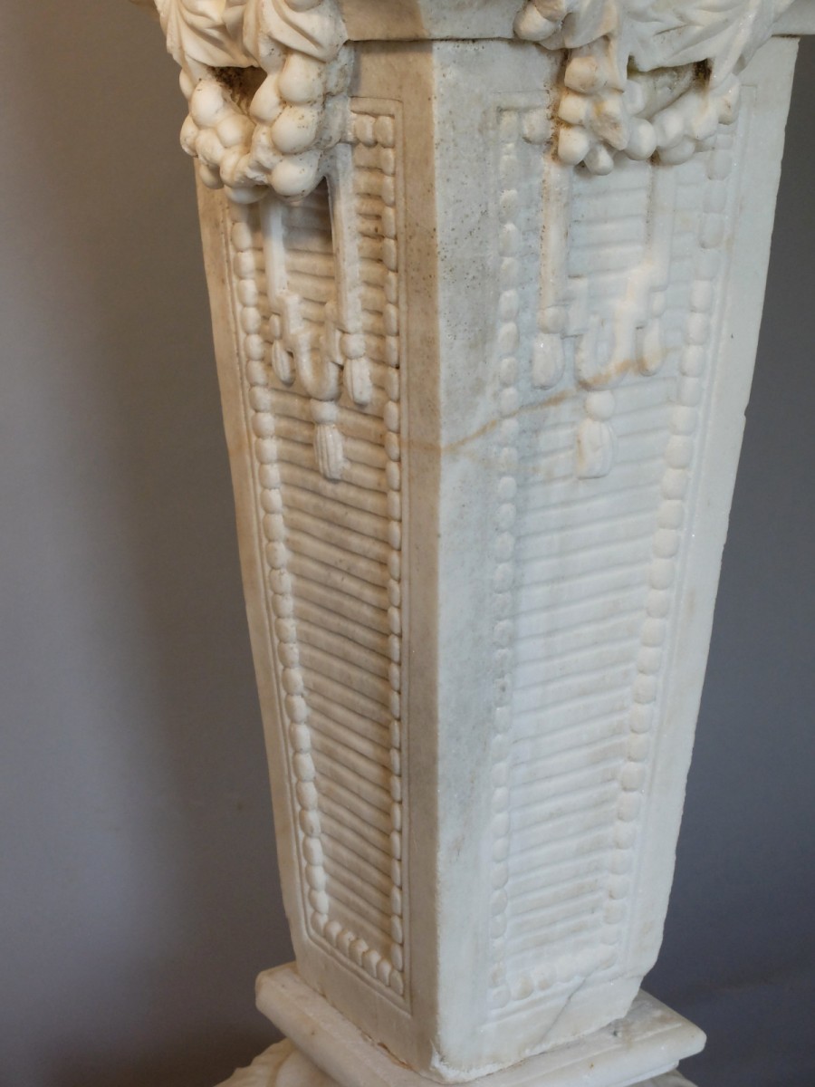 White Carrara marble garden sheath, resting on a square-section leafy base.