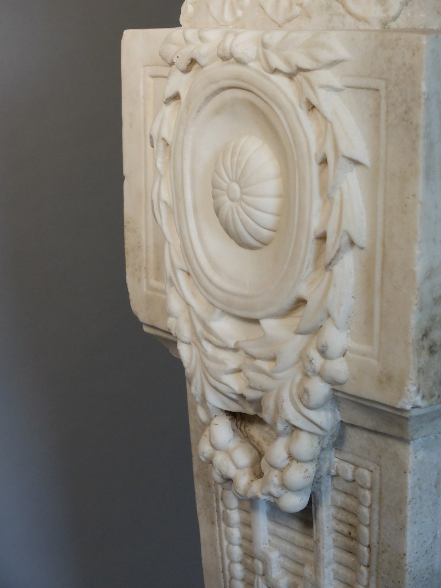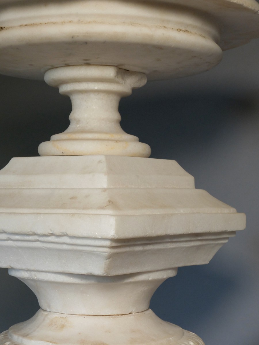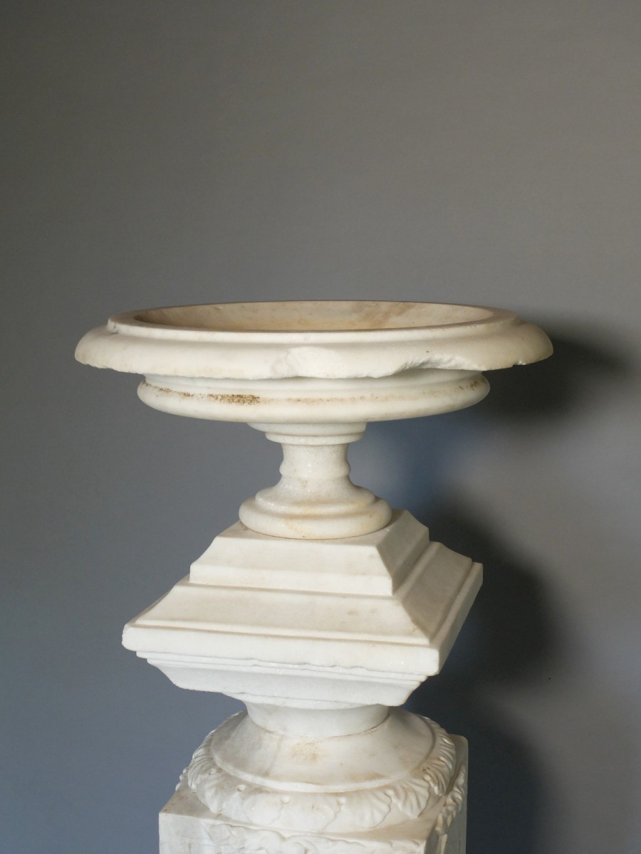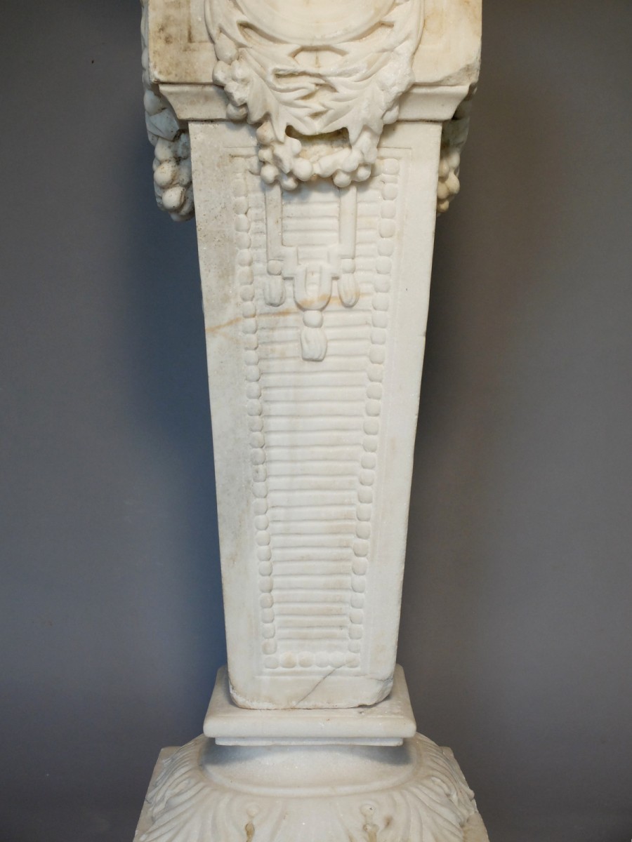 White Carrara marble garden sheath, resting on a square-section leafy base.