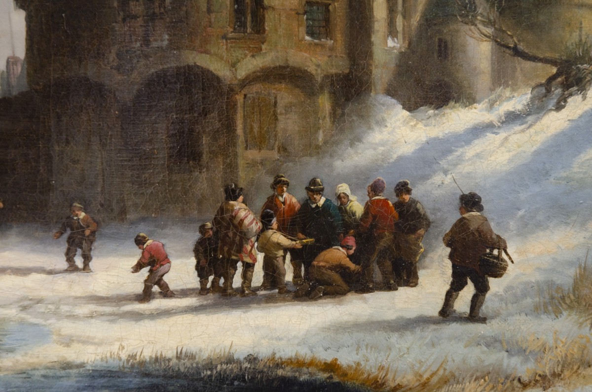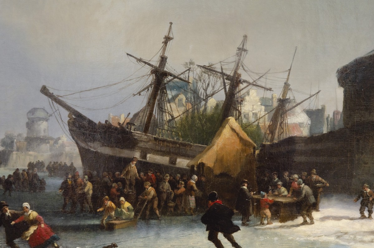 Wonderful winter landscape with skaters on the frozen water, while the town is gathering in little groups in the whole composition. A large three-masters ship sits in the ice next to a large mansion along the water. The sunlight is shining through, forming shadows on the bright white snow. Buildings typical of the north of Belgium or Holland with the skyline of a town in the back. The blue sky is clouded with white and some darker clouds. Oil on canvas signed on the right side and dated 1855. The canvas has been cleaned and relined. The frame regilded. It is a rarity on the antiques market and the perfect cozy winter landscape perfectly representing the 19th century romantic school of the North of Europe!