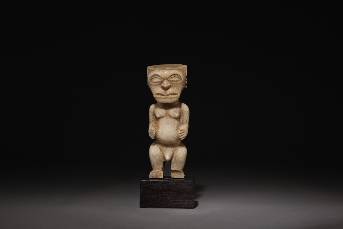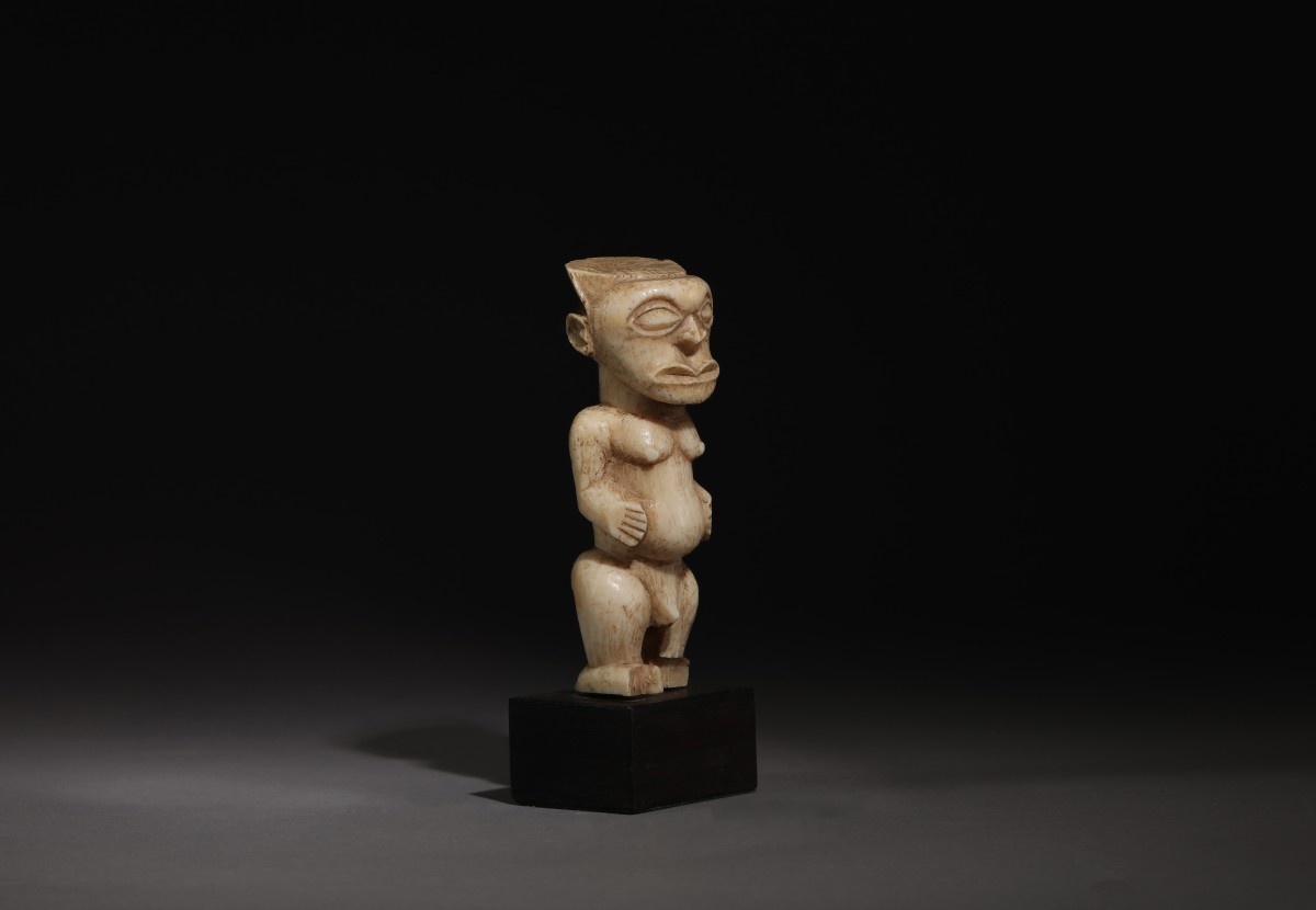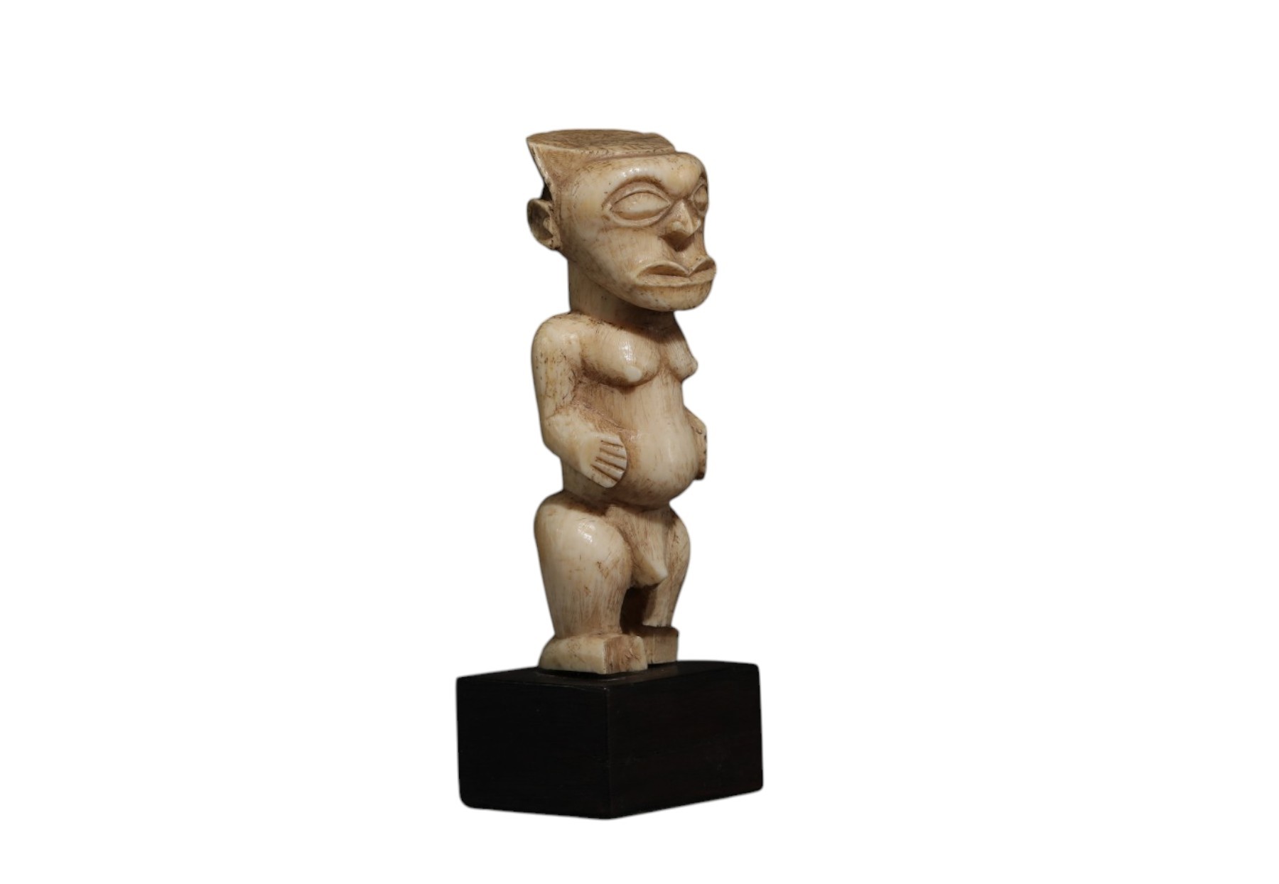 This ivory sculpture depicts a masculine figure with a stocky body and stylized forms. Its frontal and hieratic posture gives it a strong presence. The face is characterized by a prominent prognathous jaw, almond-shaped eyes, and a mouth shaped like a “figure 8.” The belly is slightly protruding, and the arms are drawn toward the abdomen — a posture that is typical in Songye statuary.