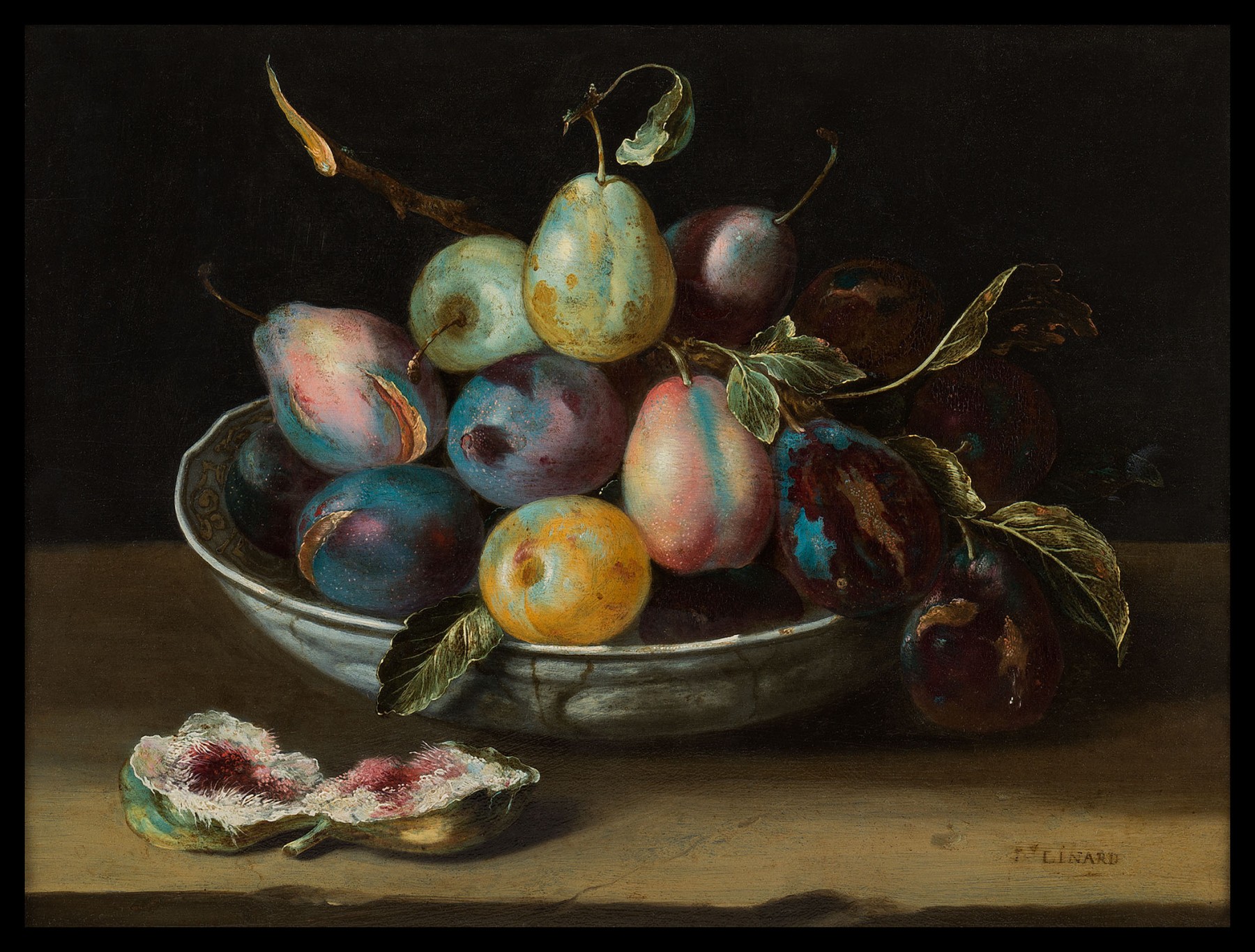“Warm colors distinguish Linard from his contemporaries; the tones are vibrant, coppery, full of a discreet, intimate light and yet with a certain sensuality (...) in the foreground, the pulpy flesh of an open fig. The summer fruits, which the painter painted repeatedly, reach such maturity that their skin splits.”