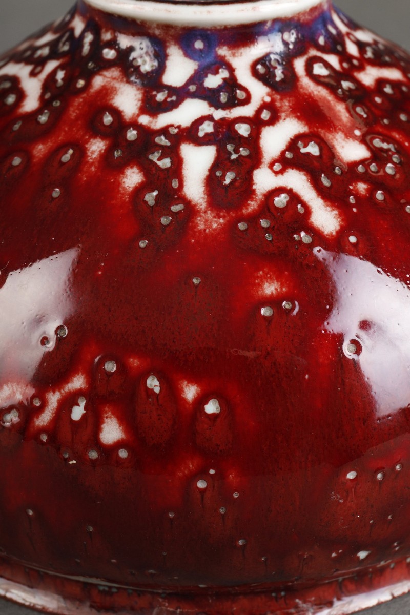 Small cabinet vase in porcelain with a rich, flamed and crimped bright red copper glaze.