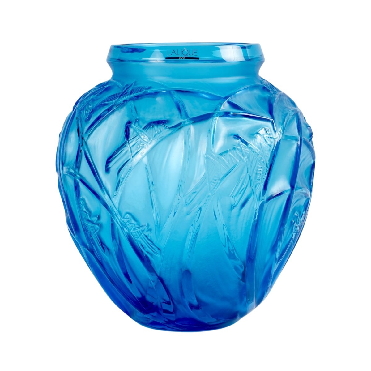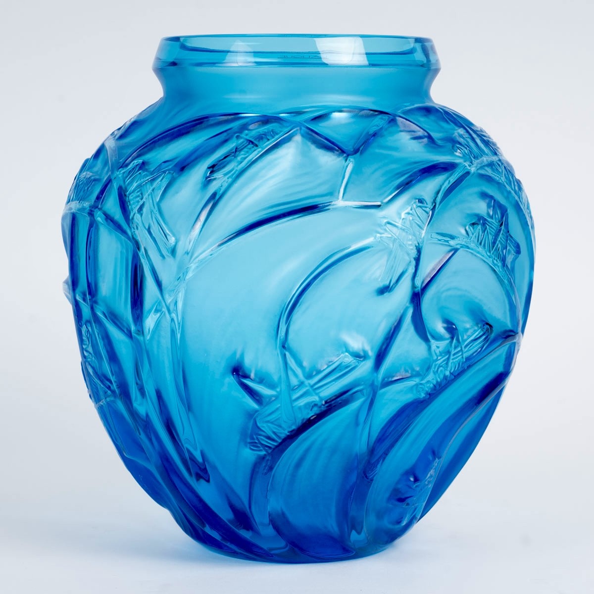 Vase "Sauterelles" (Grasshoppers) made in electric blue crystal by Lalique France after a model by René Lalique created i