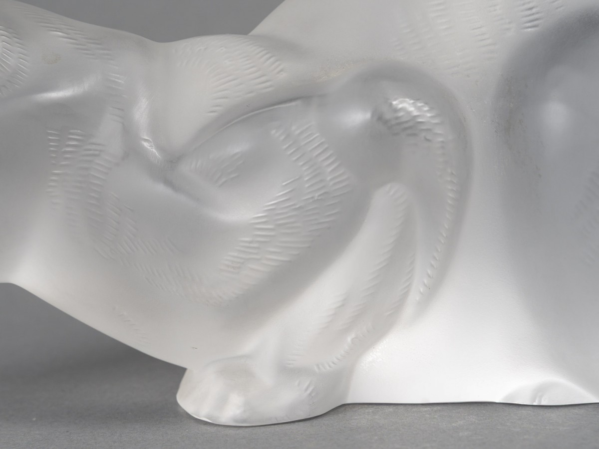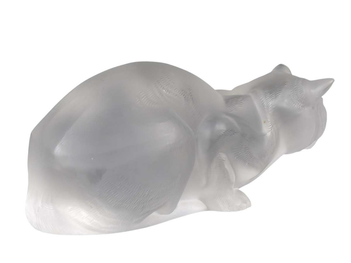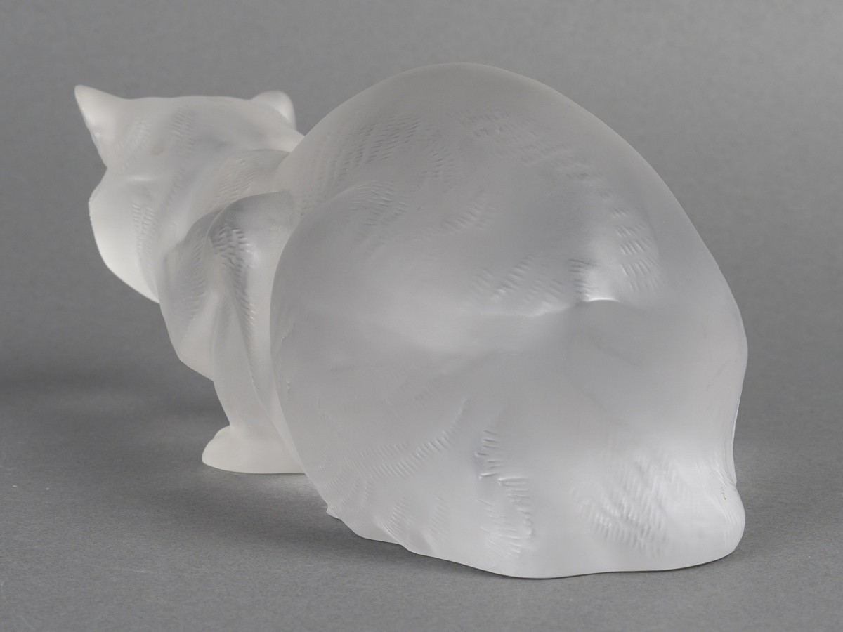 Charming satin-finished crystal statuette depicting a reclining cat, snout forward and attentively poised. The chiseled details of the fur and the opalescence of the crystal give the whole an impression of softness and realism. Model also listed in the book by Félix Marcilhac, René Lalique, master glassmaker.