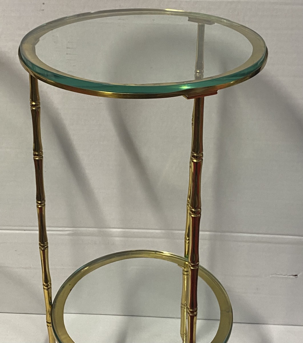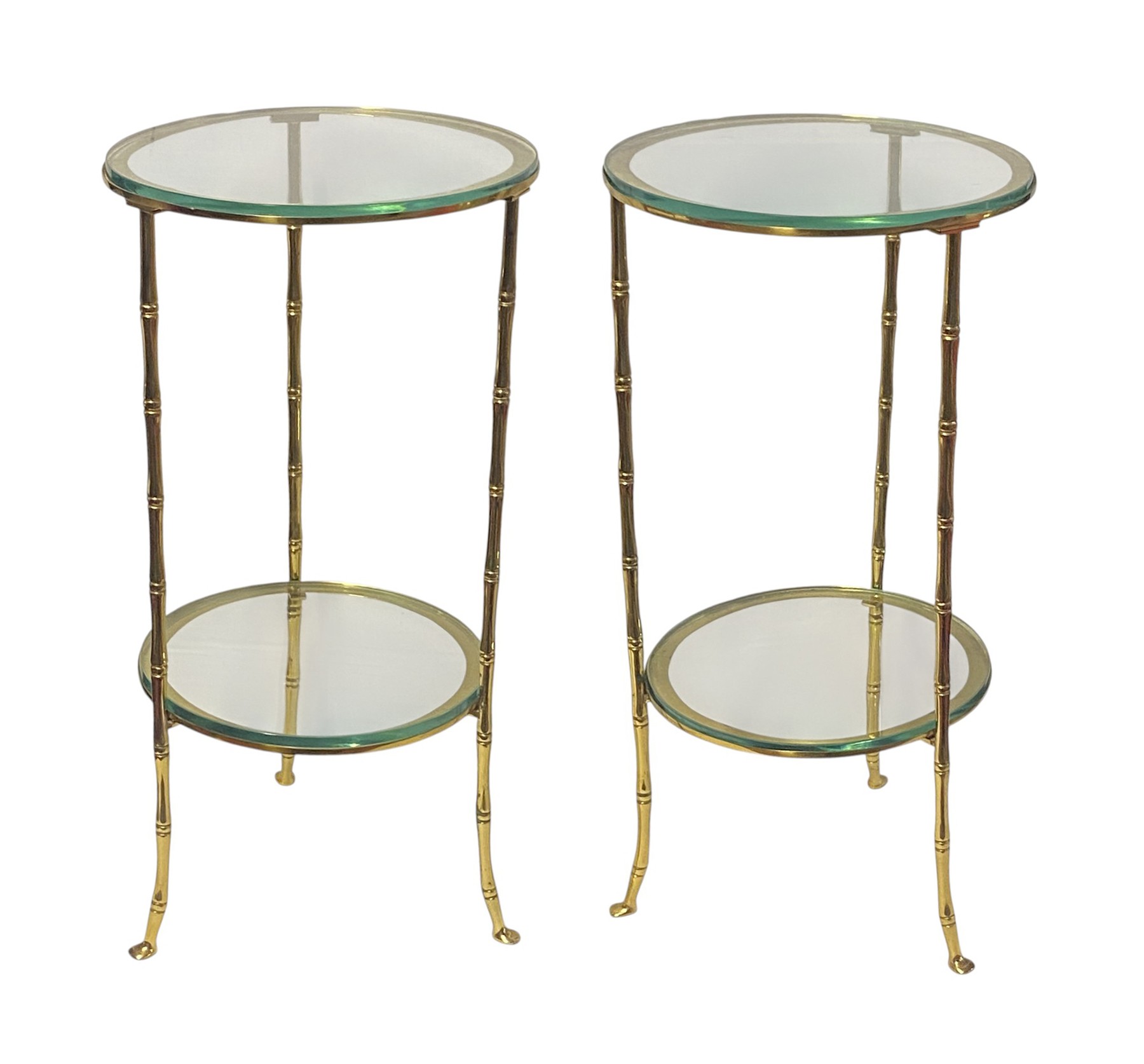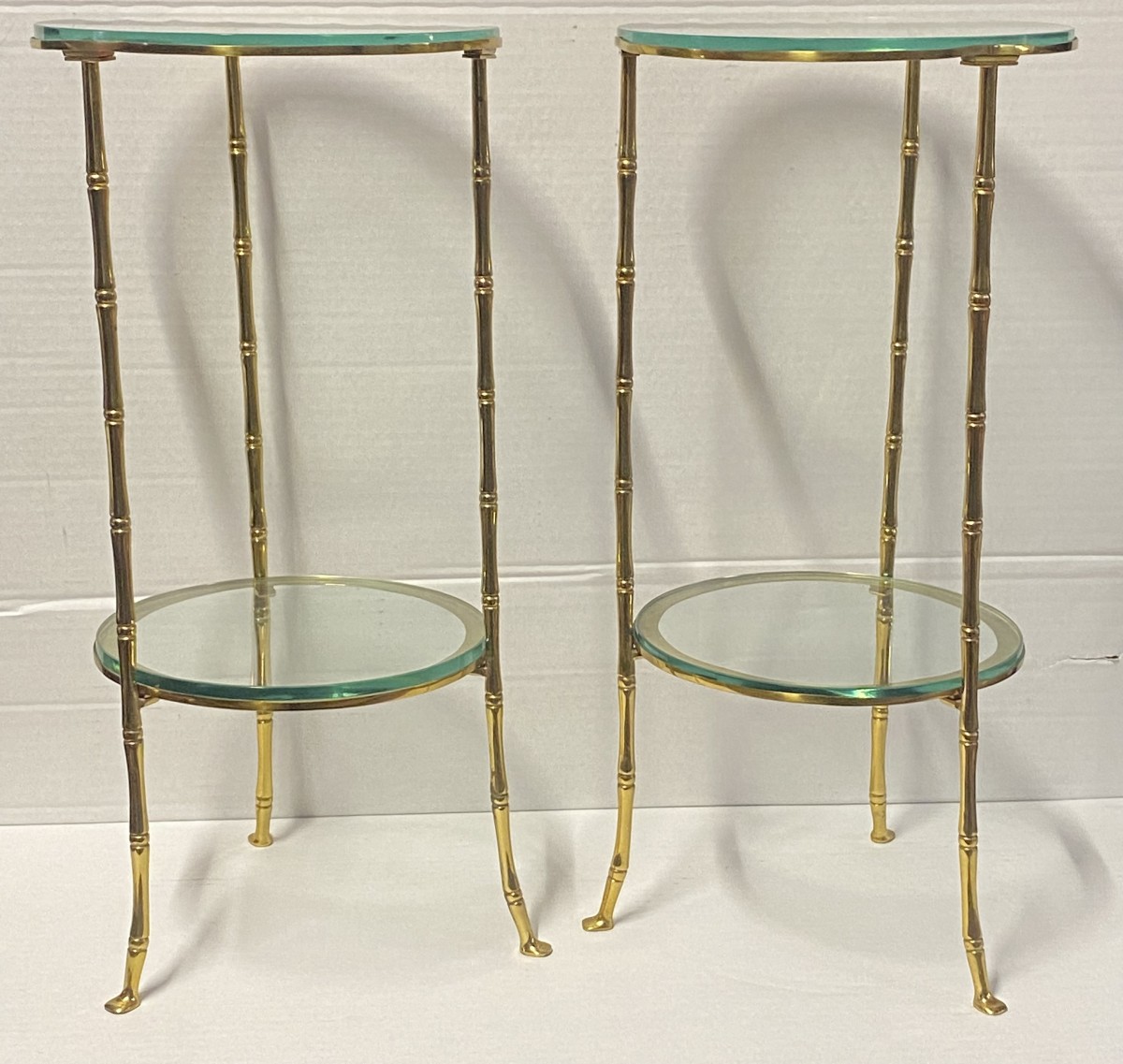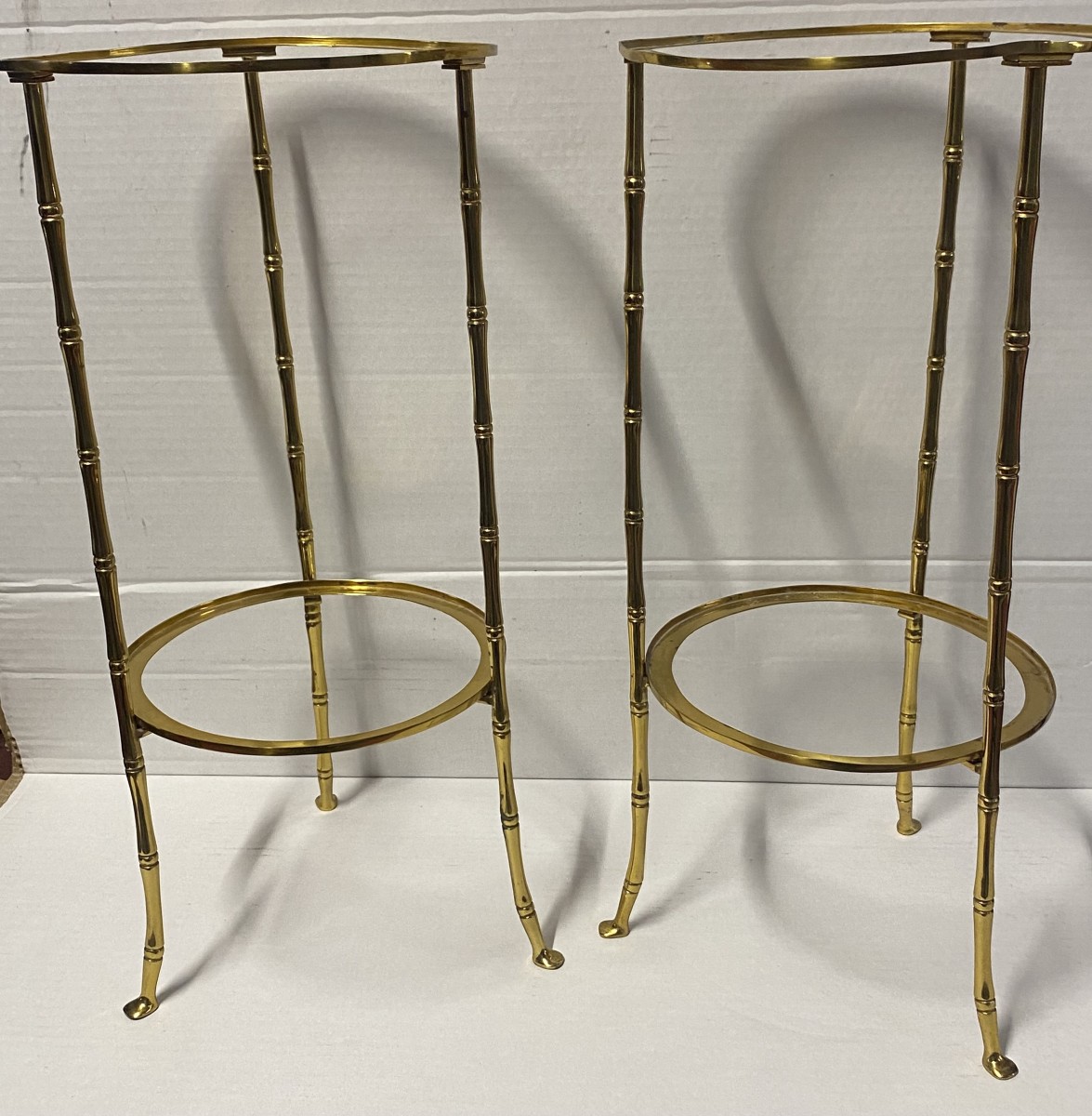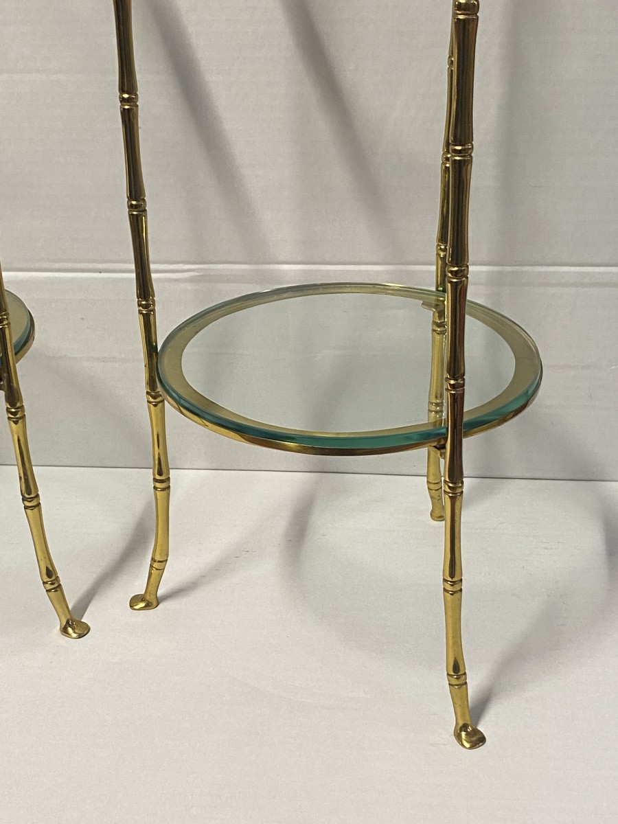 Pair of unsigned gilt bronze tripod pedestal tables with bamboo-decorated uprights and glass tops, all screwed together. Good condition, circa 1970 Height: 50 cm Diameter: 24 cm