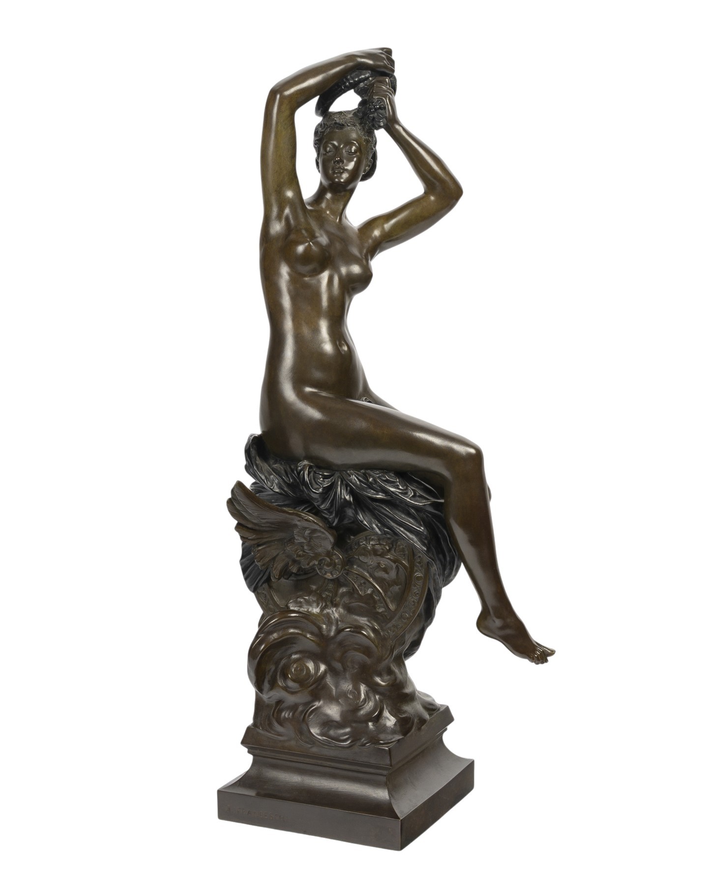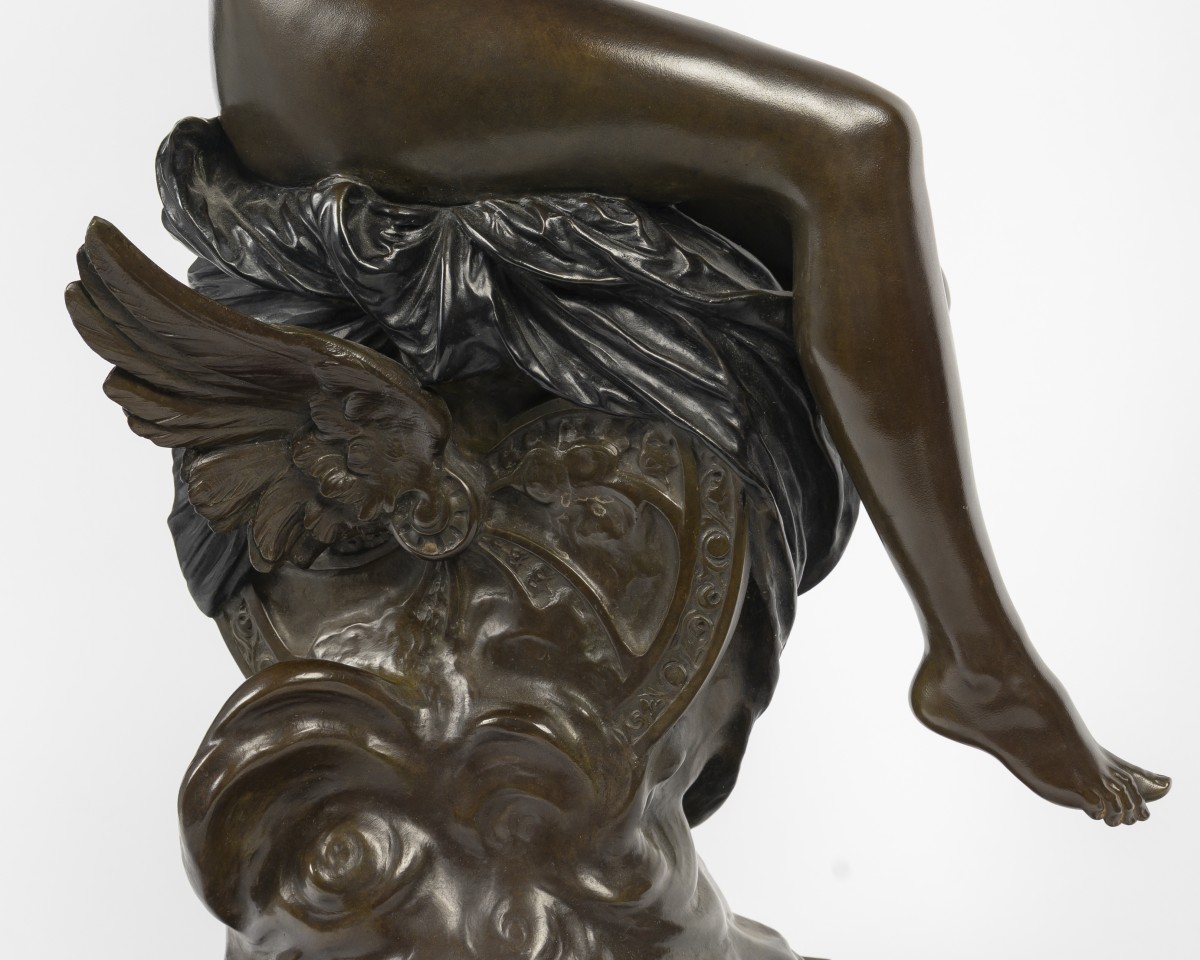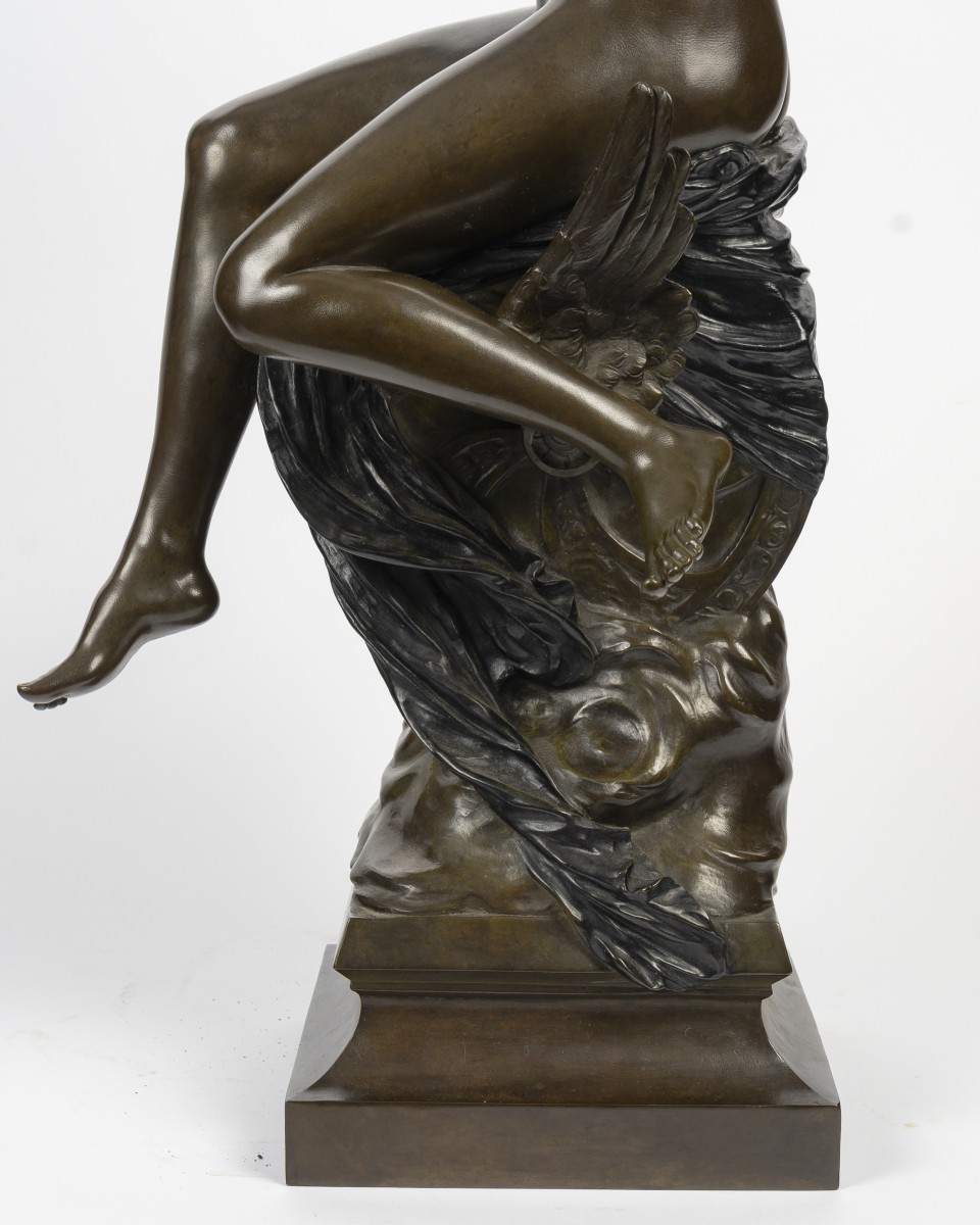 Very beautiful bronze presented at the 1886 salon representing an Allegory of Fortune. In the guise of a beautiful young woman dressed in a drape, she holds a horn of plenty and rests on a winged wheel, symbols of fortune.
