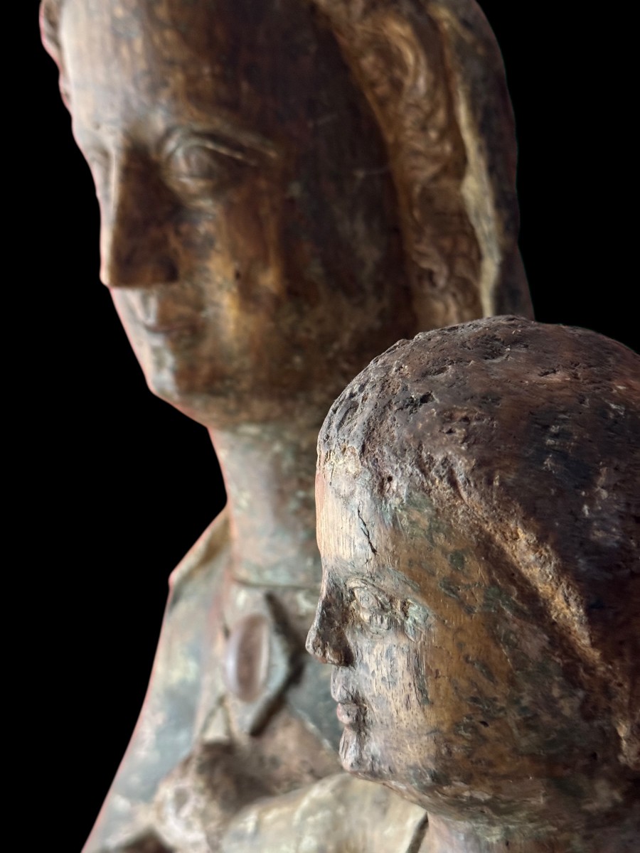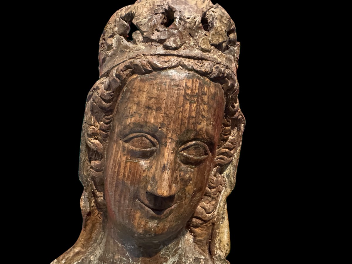 This Madonna and Child wears a long bodice and ceinture, over which is a cloak held together by a brooch (stone = cristal de roche).