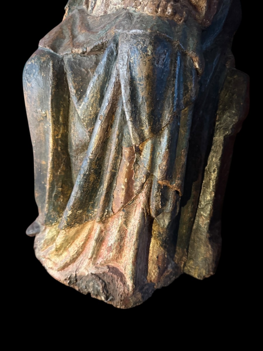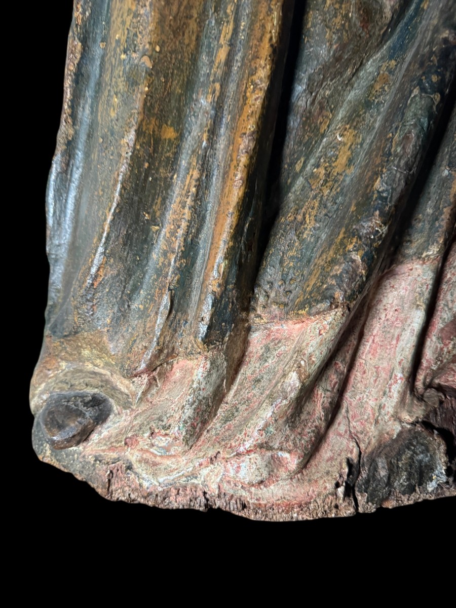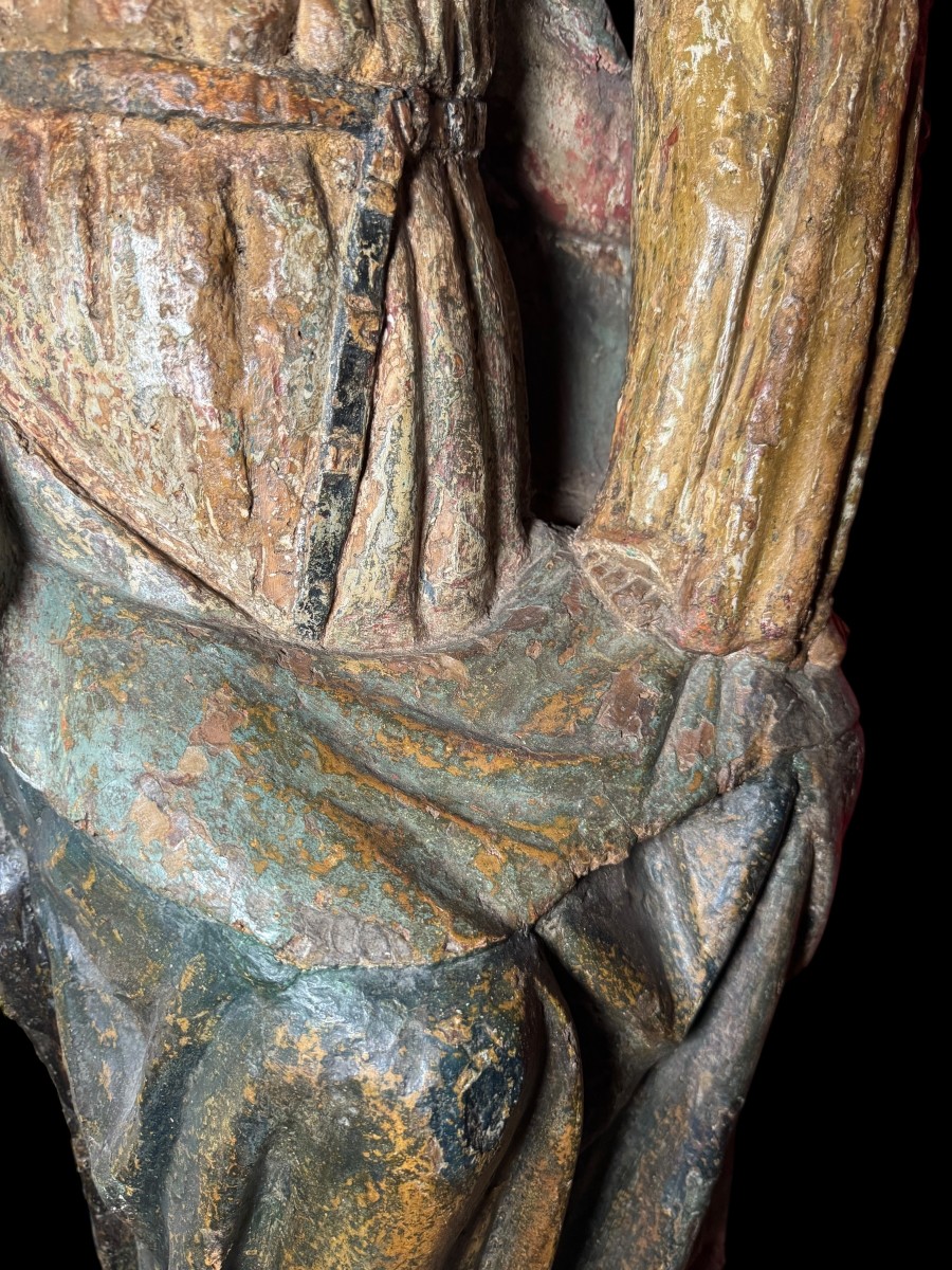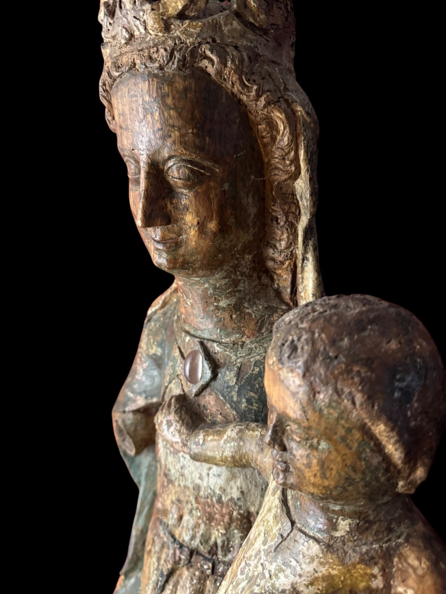 The stone (cristal de roche) is of a later date. The sculpture has been cleaned to reveal the original polychromy.