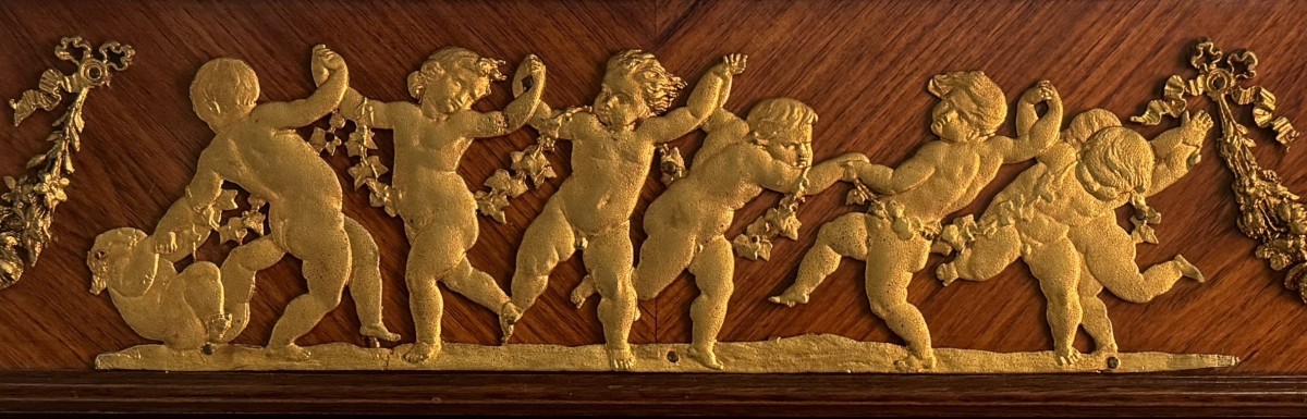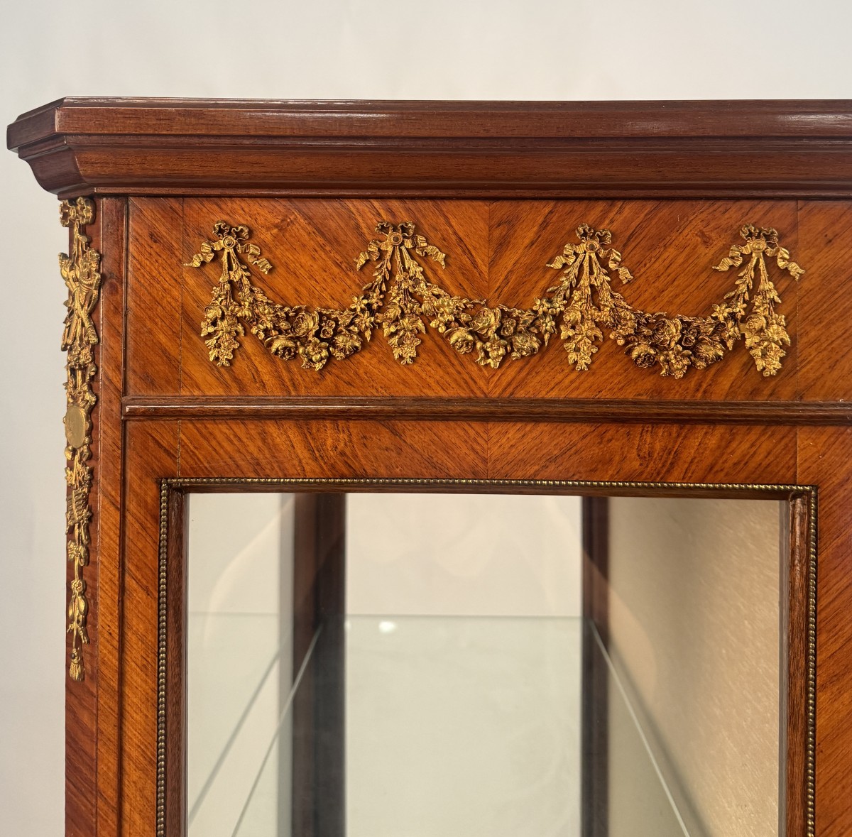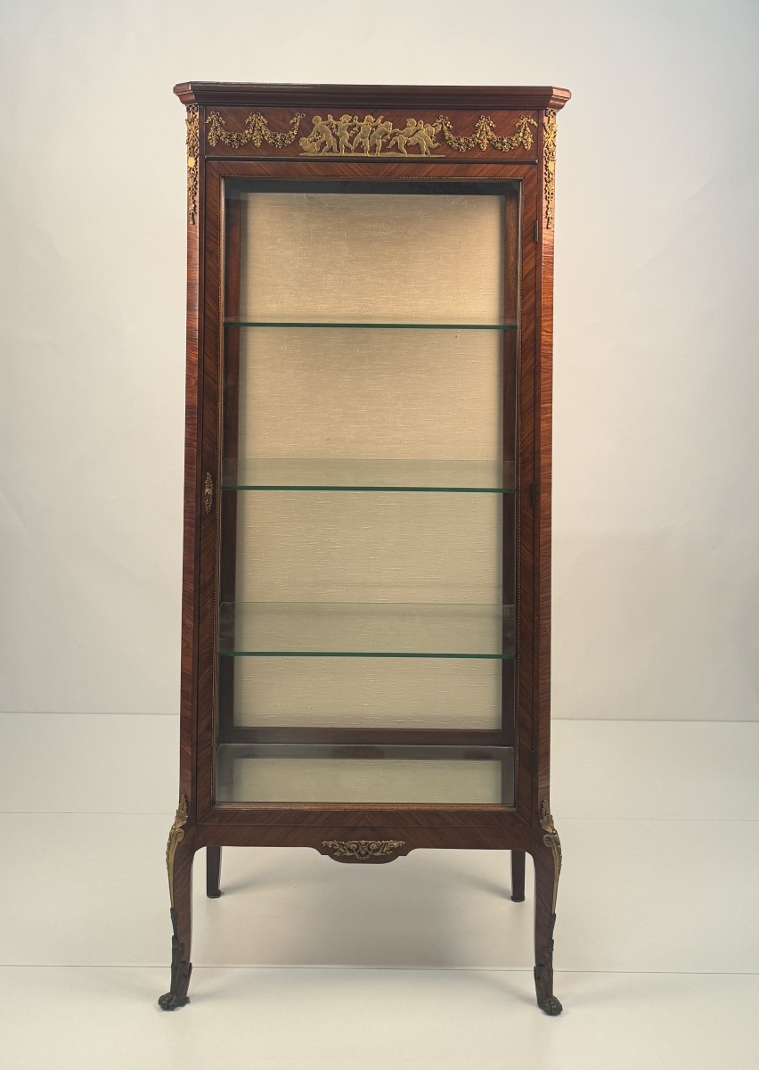Showcase veneered in bois de rose, France, late 19th - early 20th century, enriched with gilded bronze friezes, front and sides in glass, upper band decorated with a dance of cherubs among garlands of flowers repeated on the sides, a frieze with musical trophies at the corners, arched legs ending in metal shoes.