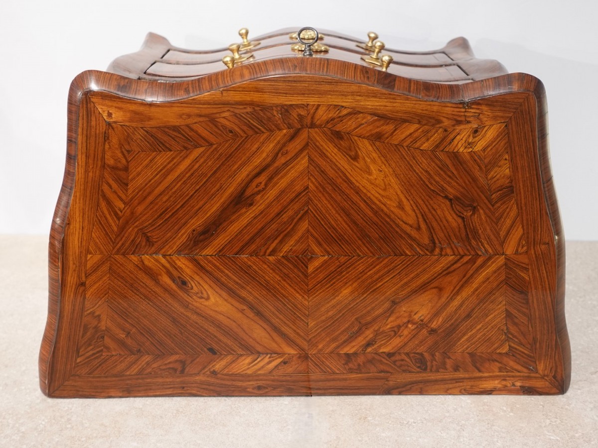 It is entirely inlaid with violet wood cut in a "butterfly wing" pattern. This technique uses and plays with the natural grain of the wood and its color variations to create geometric patterns. It emphasizes the contours of the drawers and enlivens the entire surface of the piece.