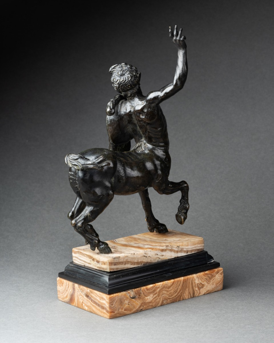 The FURIETTI centaurs represent a mature, bearded, elderly centaur with a sad expression and a young, smiling centaur with his arm raised. The original statues were found at Hadrian's Villa in Tivoli by archaeologist Giuseppe Alessandro FURIETTI in 1736; they bear the signatures of Aristeas and Papias of Aphrodisias, a city in Asia Minor, and judging by their style, these examples date from the Hadrianic era towards the end of the 1st century or the beginning of the 2nd century AD.