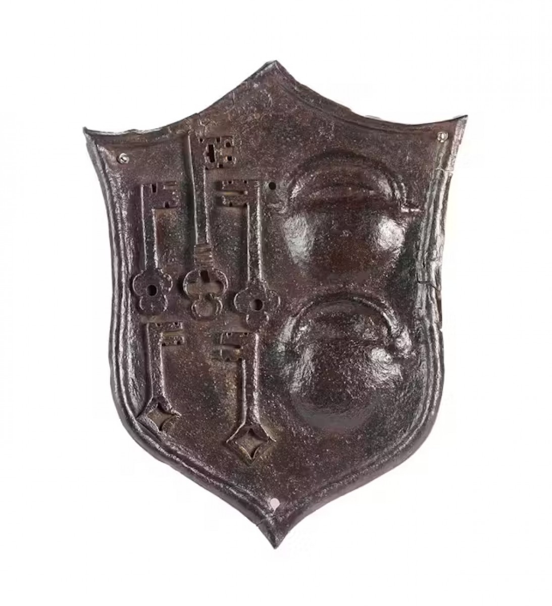 In the shape of a coat of arms, forged in iron, with a rim. Riveted to it are five examples of keys and two iron kettles with handles.