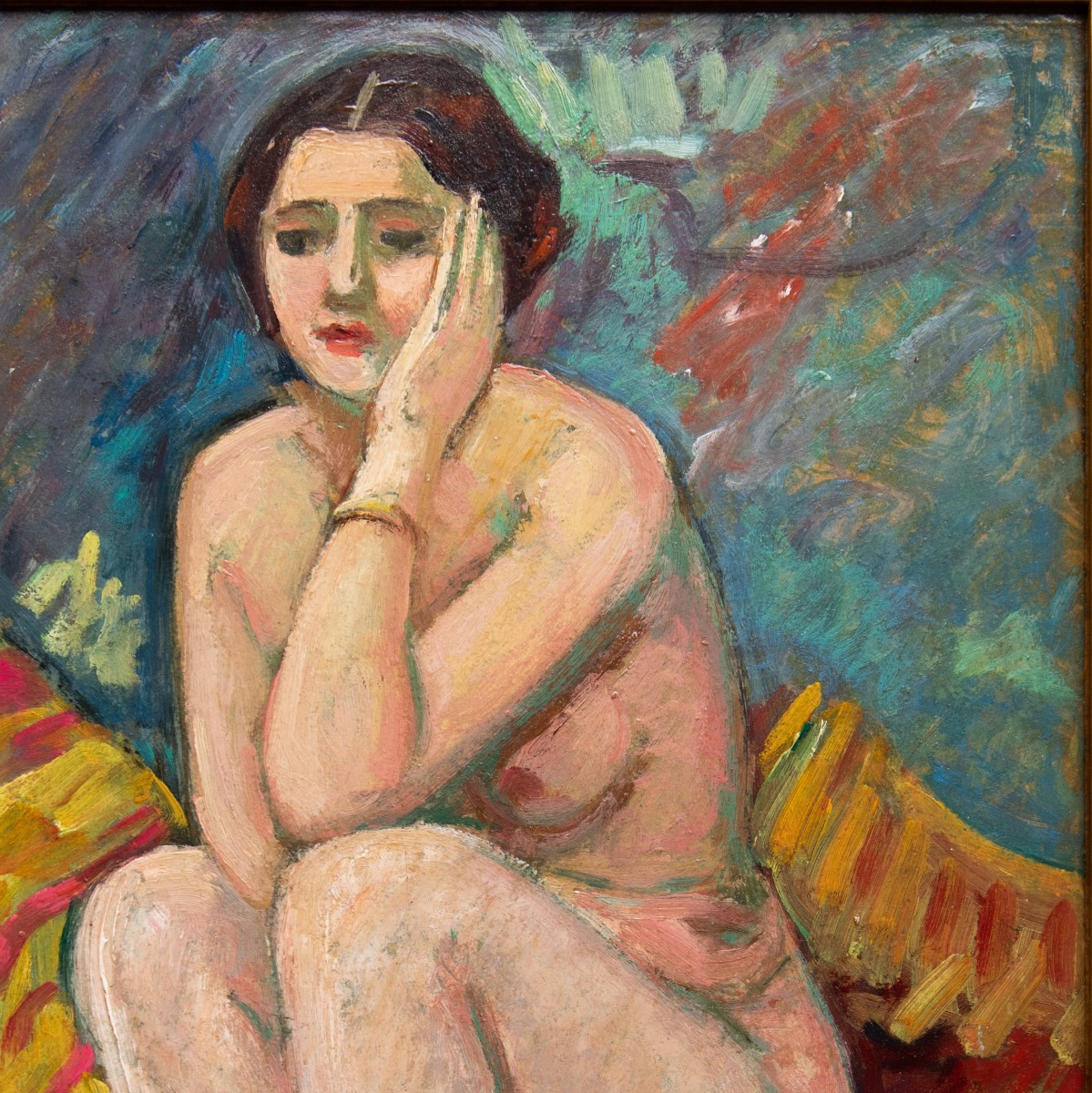 In The Little Italian Girl, painted in 1938, Puy revisits the theme of the female nude in an atmosphere of quiet reflection. The model, seated on richly coloured cushions, rests her head on her hand in a pose tinged with melancholy. The palette blends deep reds, golden tones and turquoise accents in broad, vigorous strokes that fuse figure and setting into a single vibration. The body, shaped by light, retains the soft volumes of his earlier studies, while the richness of the chromatic range reaffirms the painter’s enduring allegiance to the Fauvist spirit.