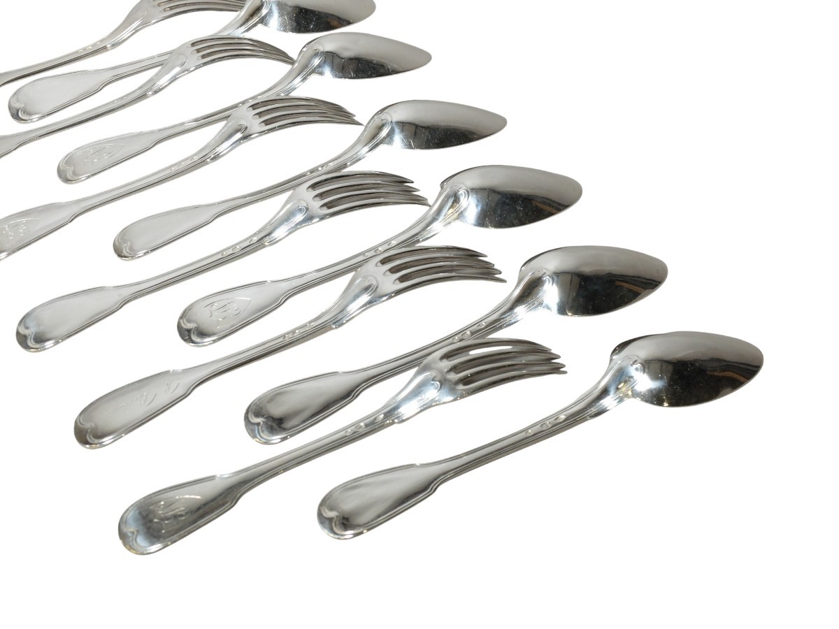 Beautiful set of 12 solid silver cutlery, fillet contour model, hallmarked with the 1st rooster (1798-1809).