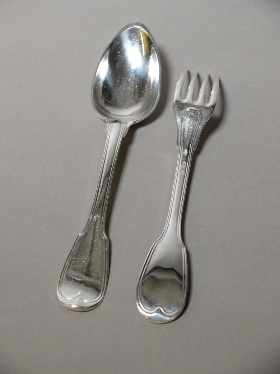 - 2 forks of the same model are hallmarked with the 2nd rooster (1809-1819). One is marked R. Bertaux on the spatula.