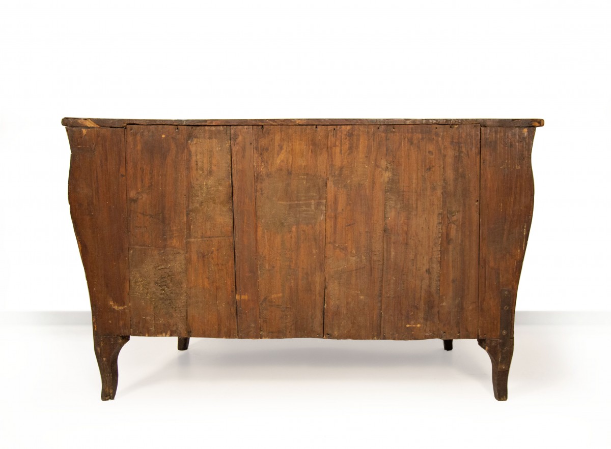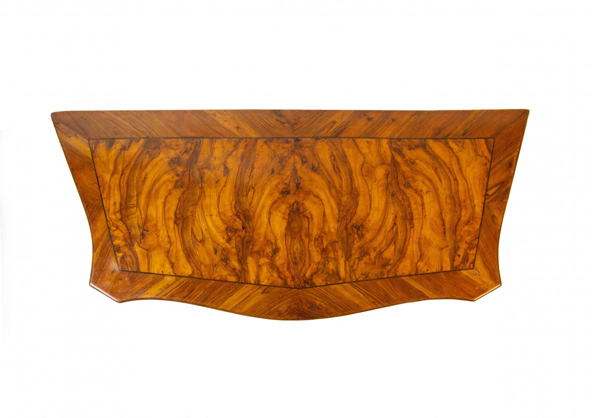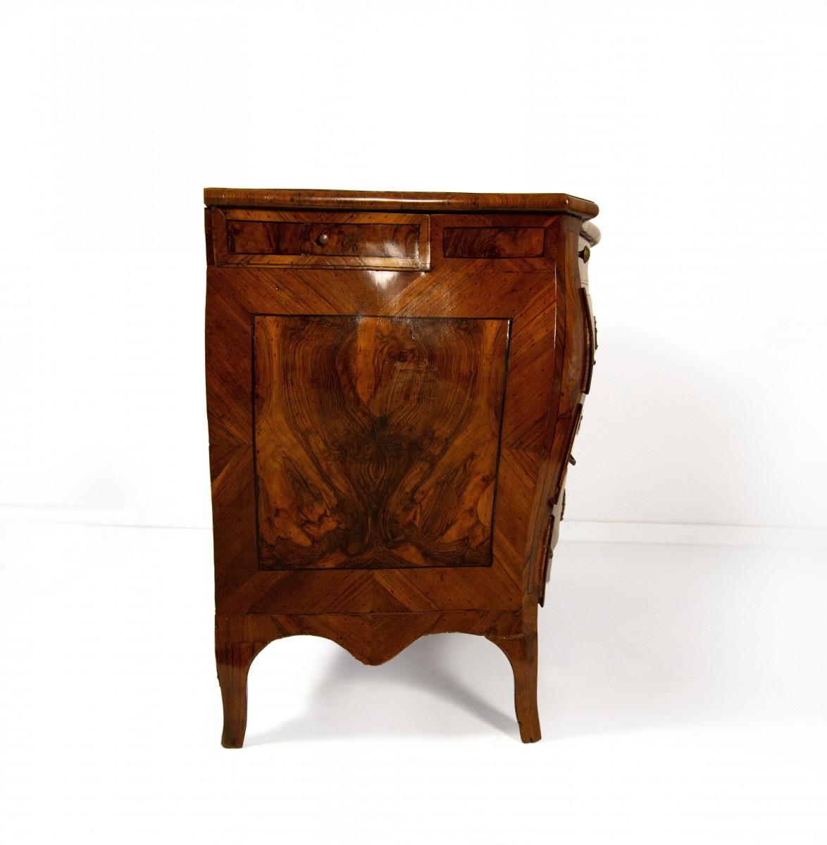 Chest of drawers veneered in carob, walnut, and briar, Modena, mid-18th century, curved body, slightly curved front with three drawers separated by a crosspiece and surmounted by a small drawer under the top. Pronounced side pilasters; two small drawers under the top on the sides; shaped apron and curved feet, 88 x 147 x 64 cm