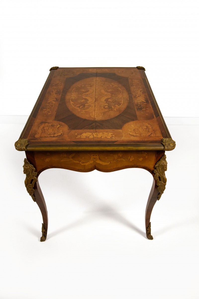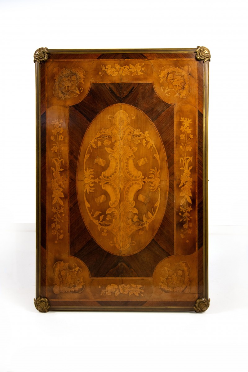 A desk inlaid with various woods, early 20th century. The top is decorated with an oval centered by coats of arms, and the frame features flowering vines. The drawers are shaped like a belt, with three drawers and three simulated drawers on the opposite side. The foot features gilded bronze metal shoes. Dimensions: 74.5 x 114 x 76 cm.