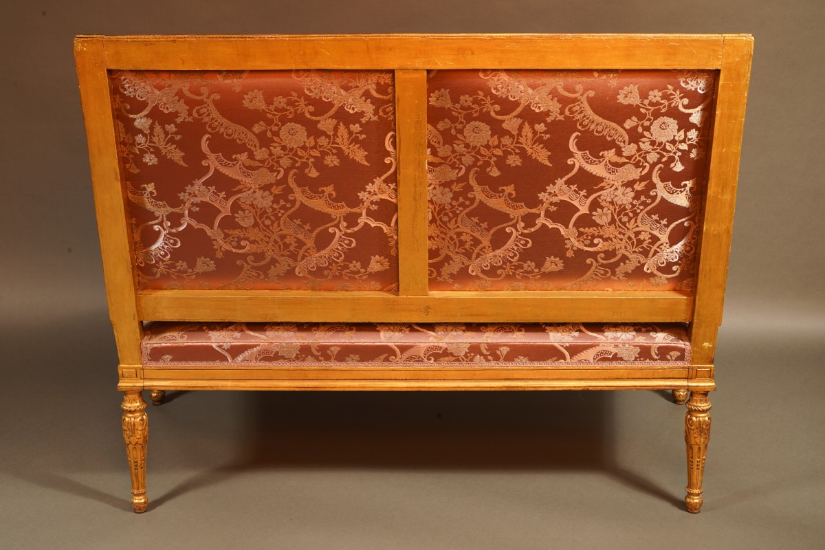 Richly carved gilded wooden sofa, upholstered in pink silk decorated with Japanese motifs, imagined after the 1788 model made by G. Jacob for the Castle St Cloud.