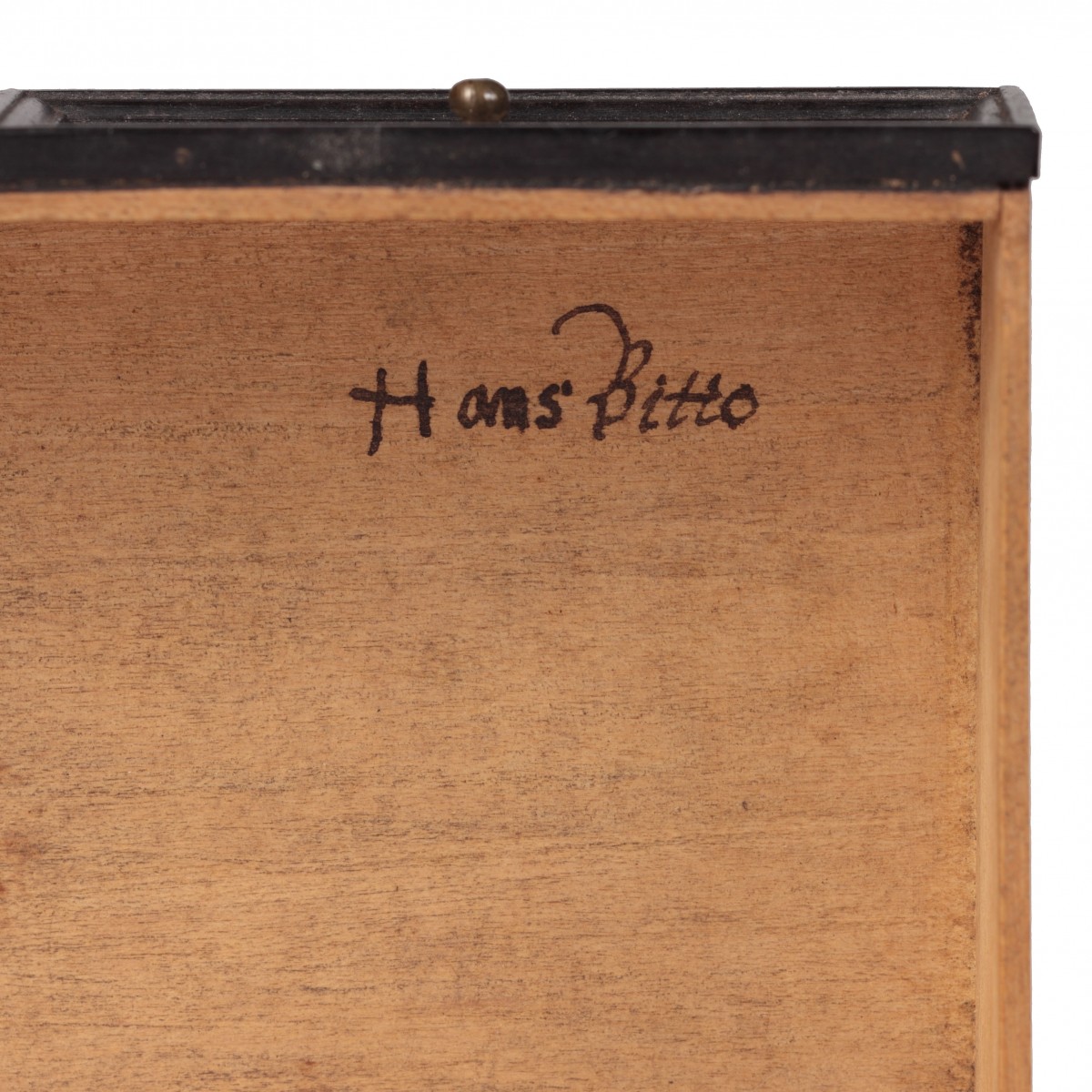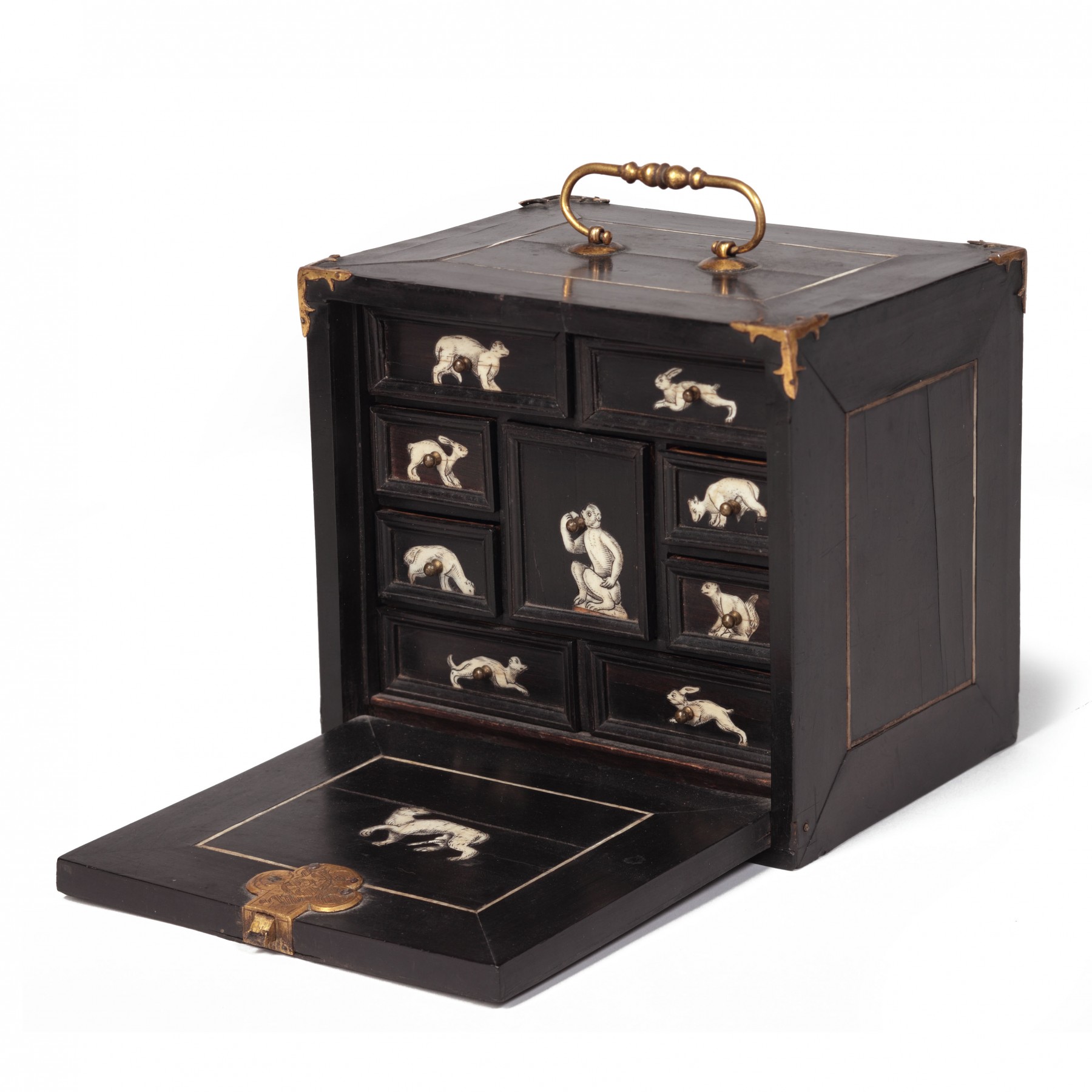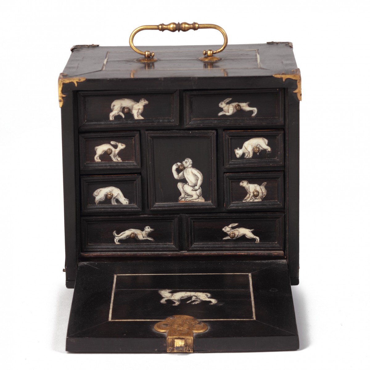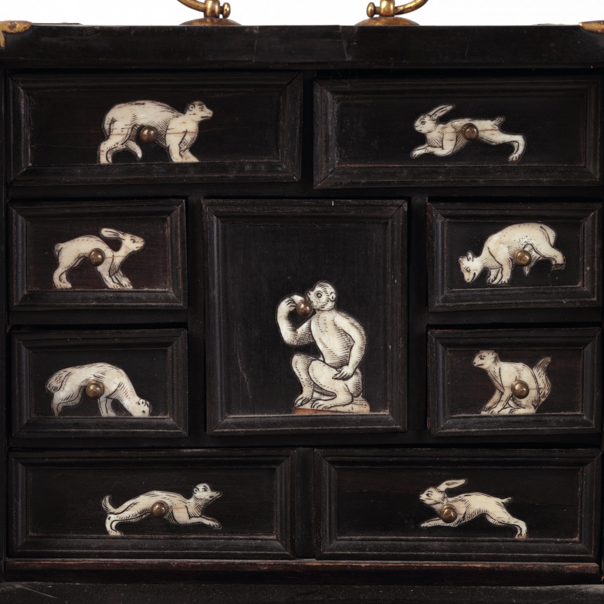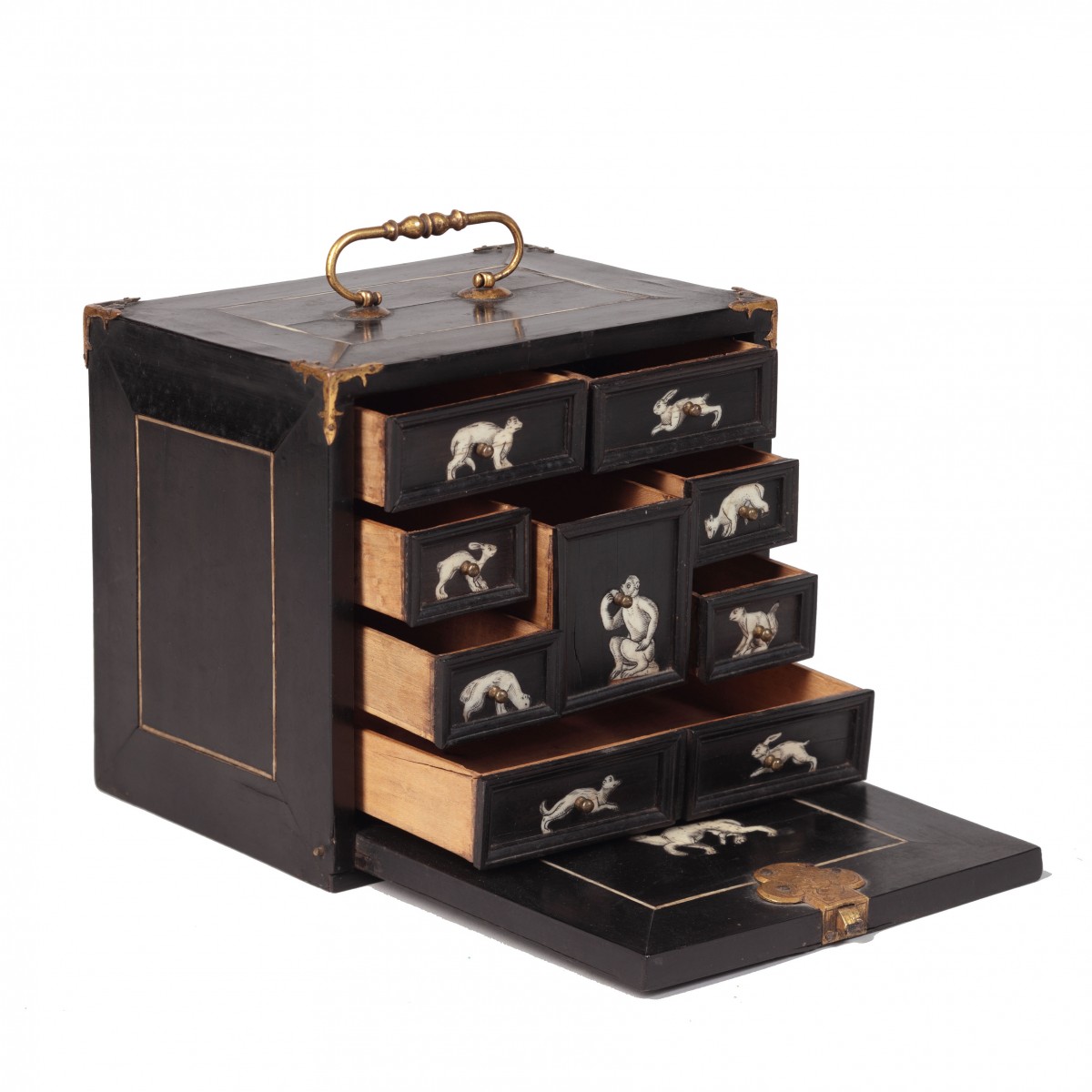 Veneered with ebony and bone animals ; 8 drawers and one secret drawer.