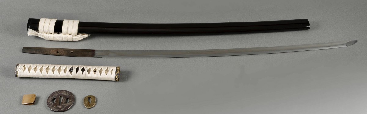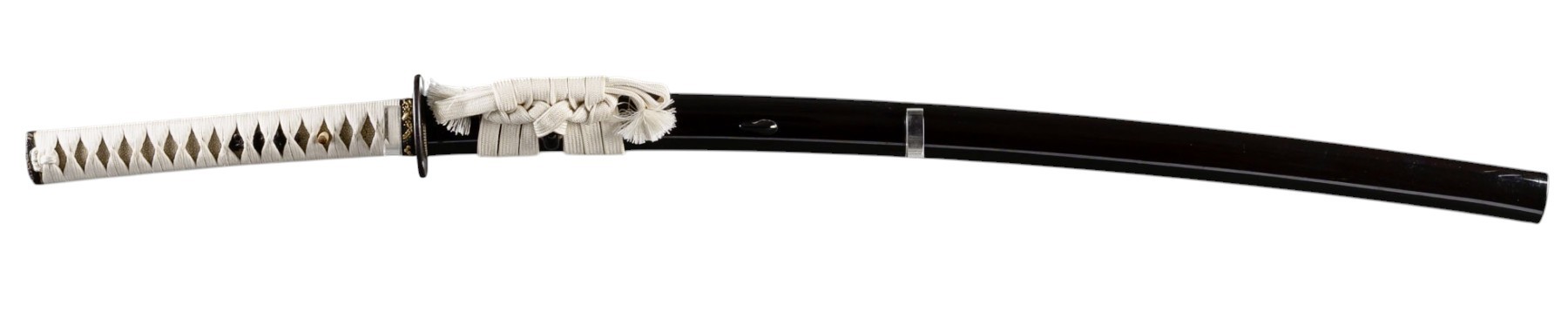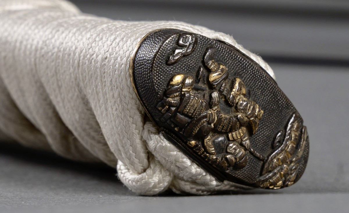 The tsuka is wrapped in white silk and adorned with a shakudo nanako of a fuchigashira, decorated with a carp in breaking waves and a samurai under a pine tree.