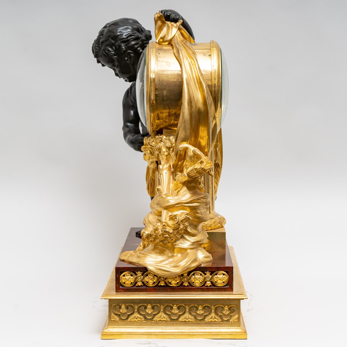 The ensemble rests on a rectangular base of griotte marble, highlighted in the upper part by a double frieze in gilded bronze with floral and interlacing motifs, and in the lower part by a frieze of alternating spandrels and acanthus leaves.