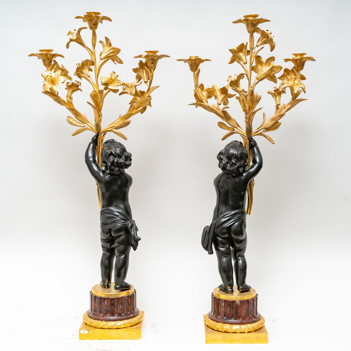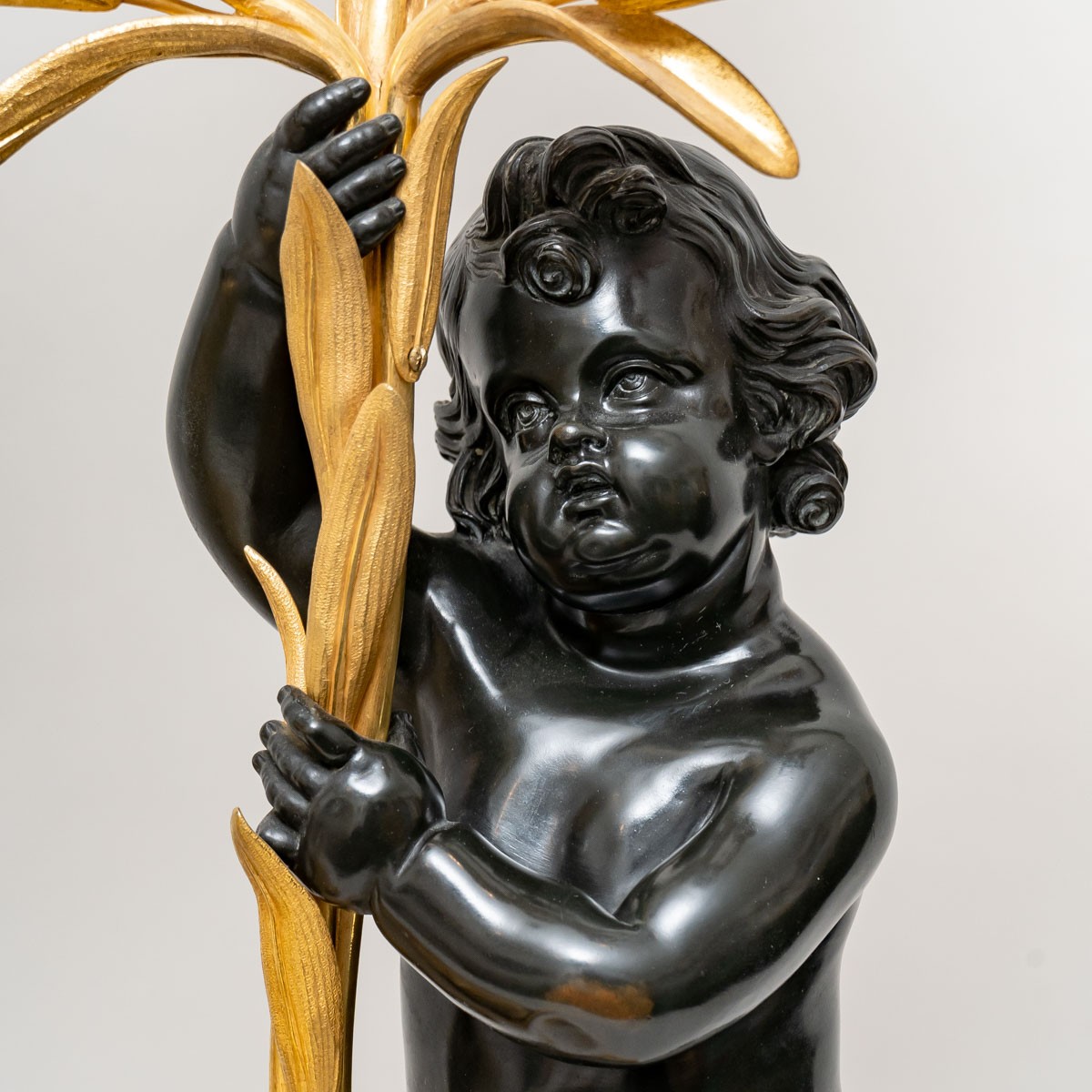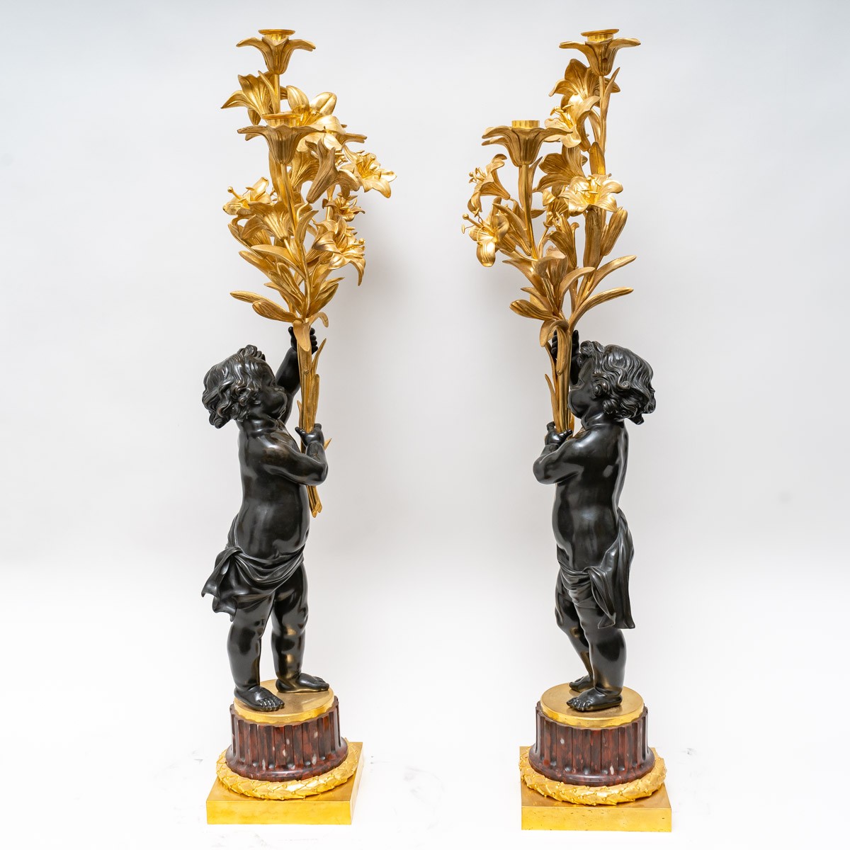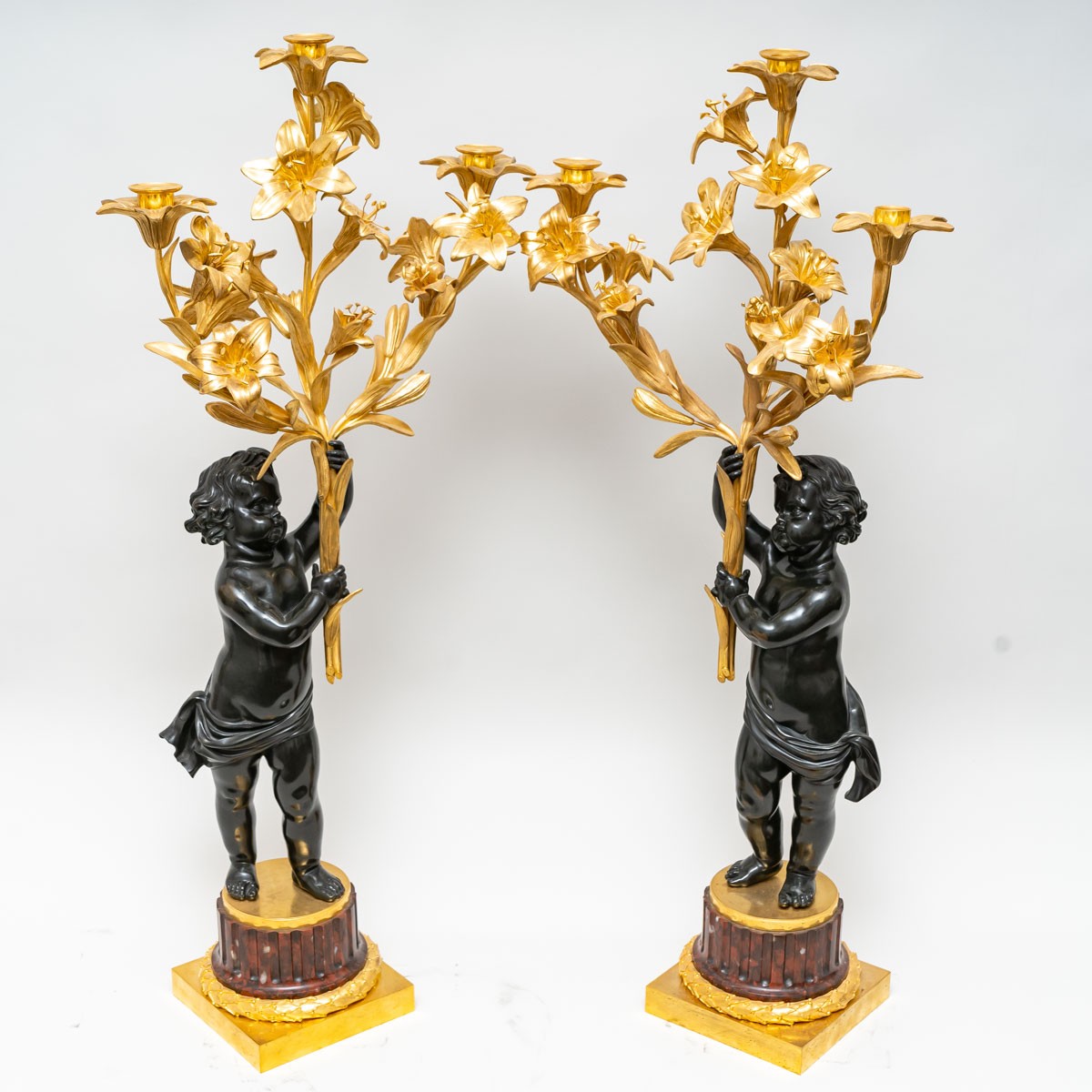 The patinated and gilded bronze candelabra depict two putti holding three fleur-de-lis ending in three lights.