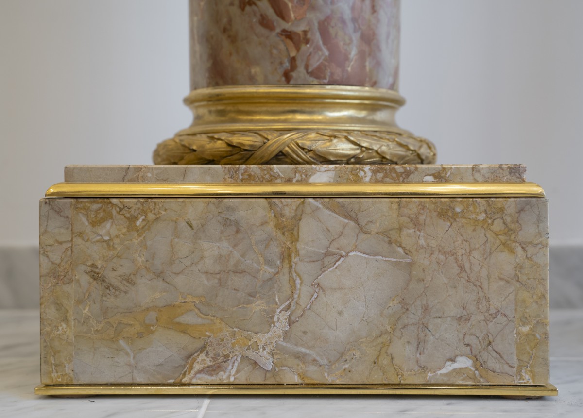 Each carefully polished cylindrical shaft is topped with an Ionic capital decorated with volutes and a frieze of finely chiseled and gilded bronze ova.