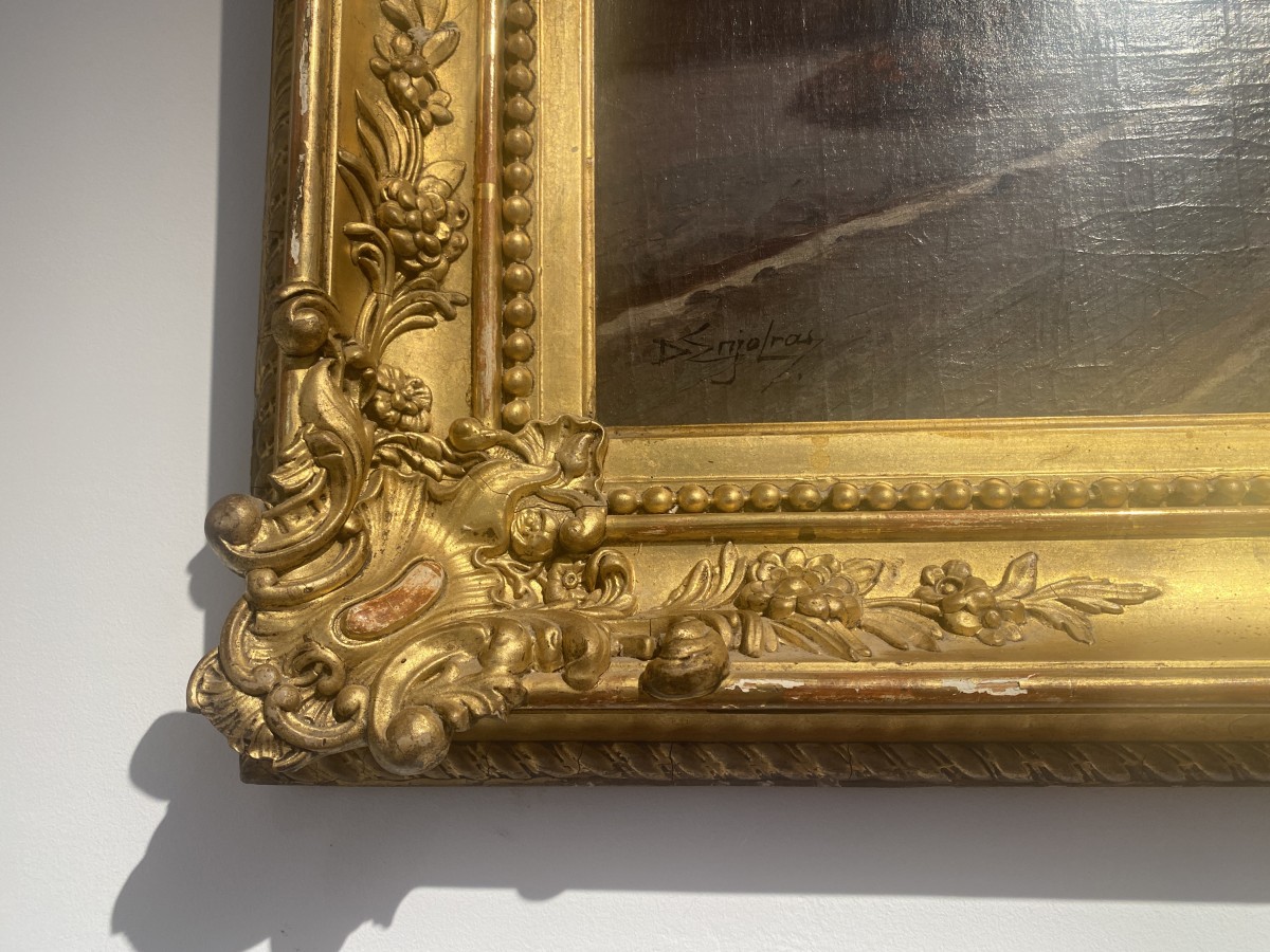 In this luminous composition, Delphin Enjolras momentarily turns away from his intimate interiors and scenes of women by lamplight to focus instead on the landscapes of southern France. Beneath a sky set ablaze by the last light of sunset, a herd of bulls makes its way back to the manade, guided by two gardians barely visible in the dimness of the path. The evening light reflects on the damp ground, revealing the artist’s mastery in capturing atmosphere and reflection.