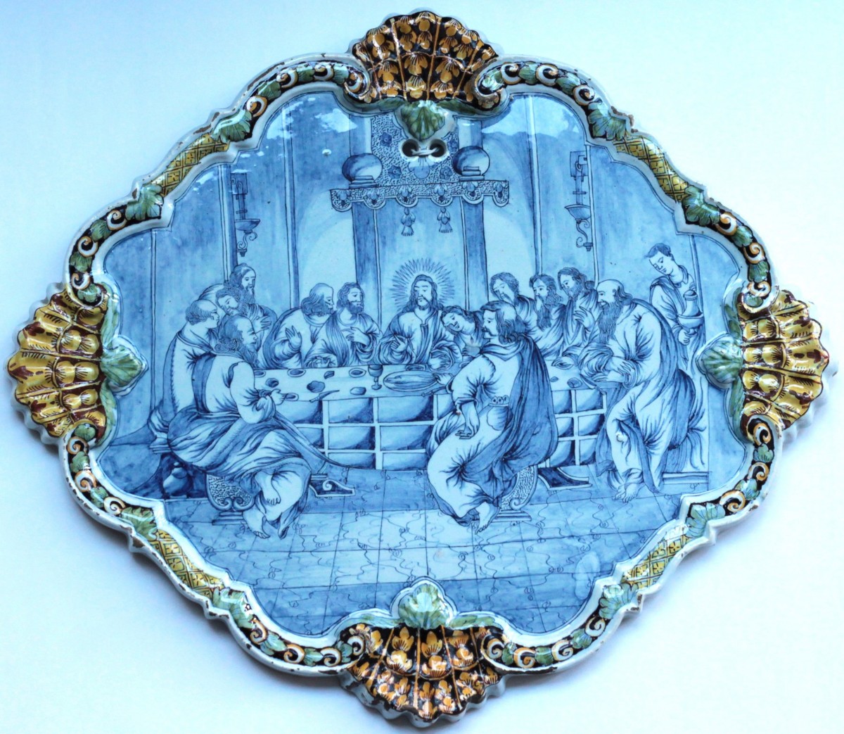 Oval plate with contoured edge in Delft earthenware with blue monochrome decoration depicting the Last Supper, polychrome frame with a band interspersed with four stylized shells.