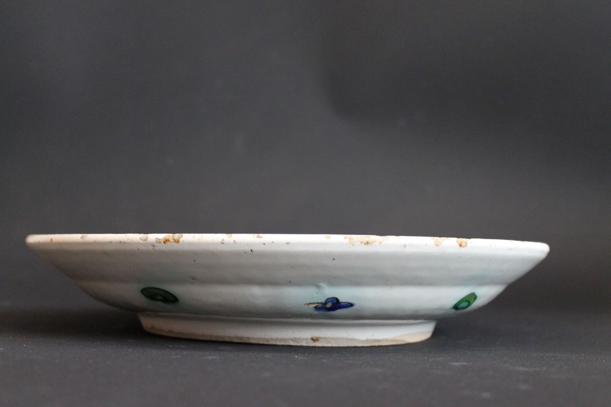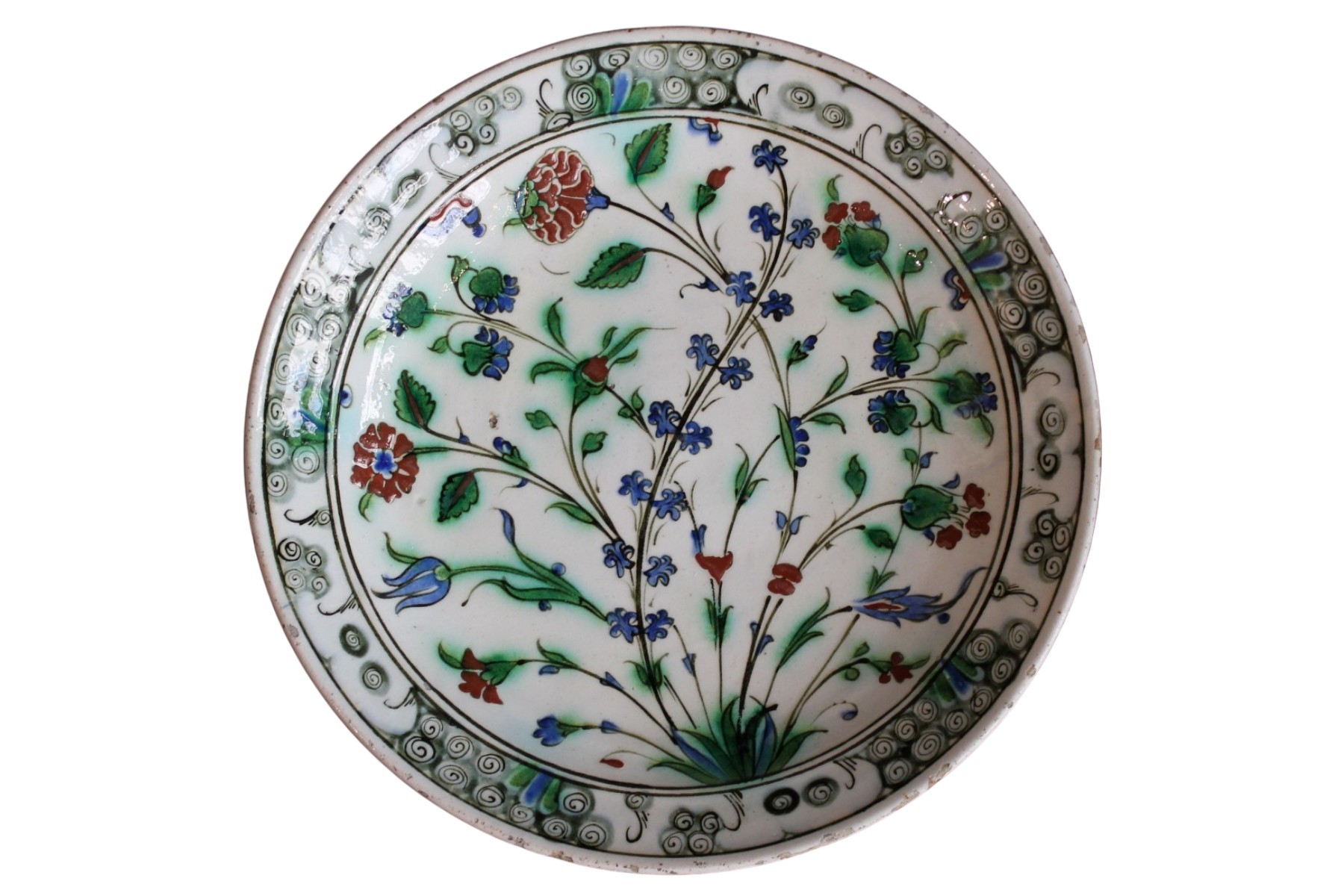 Siliceous ceramic dish from Iznik (Turkey) with polychrome decoration in the center featuring four flowers—tulips, carnations, wild roses, and roses—on long stems. Rim decorated with stylized rocks and waves. Ten floral motifs on the back.