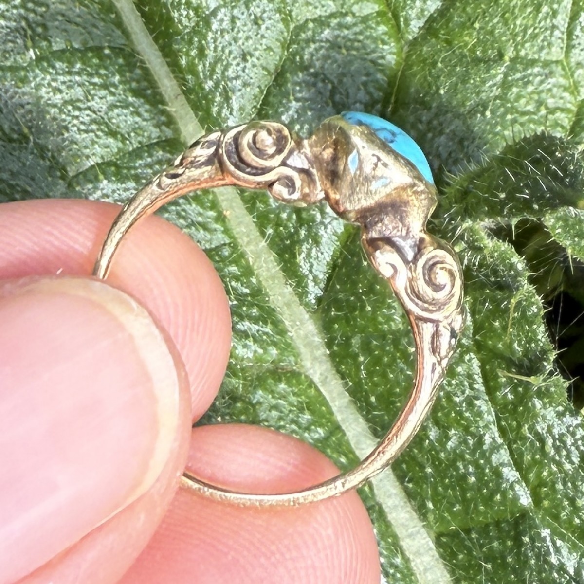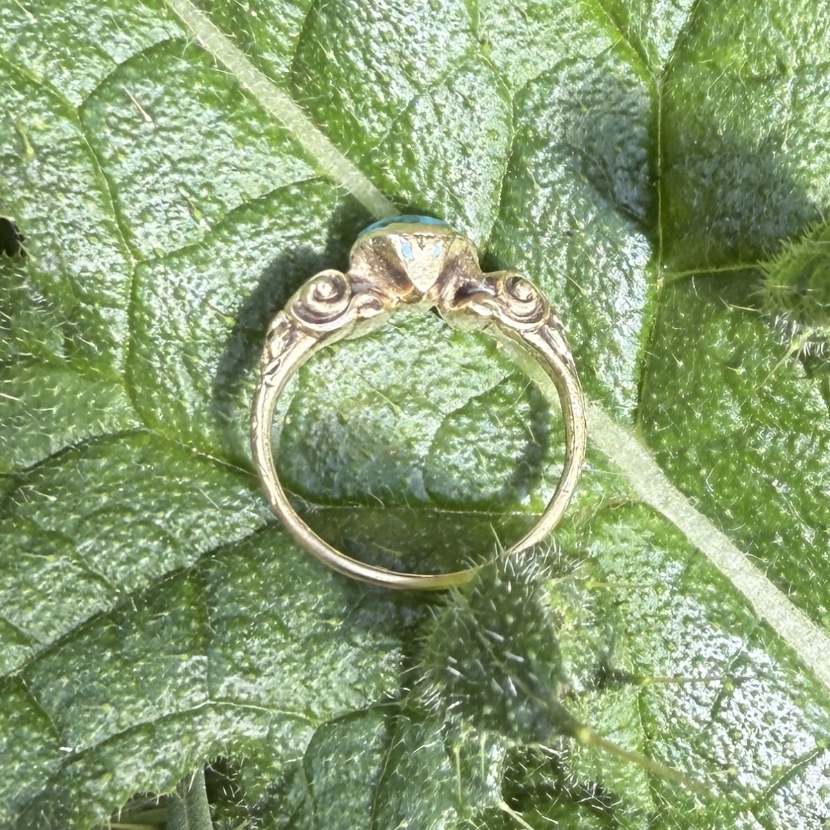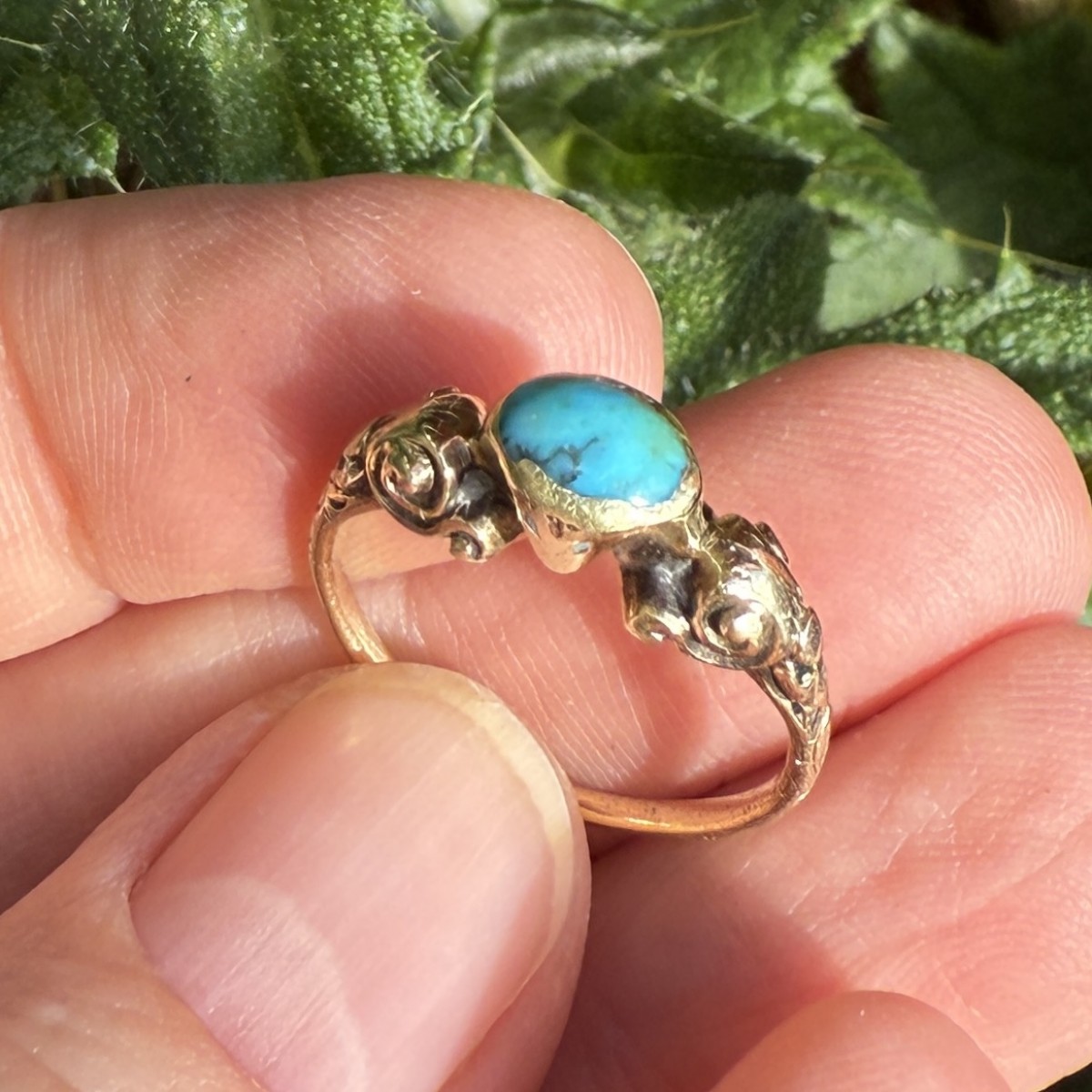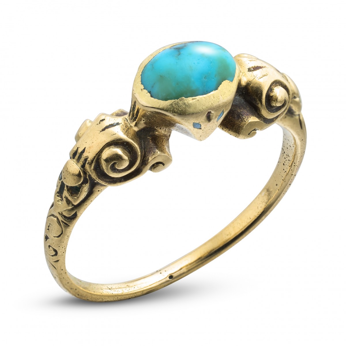 A Renaissance gold ring set with an oval cabochon turquoise in a plain collet bezel. The shoulders are ornamented with scrolling motifs and traces of original blue enamel. The ring is finely modelled and well worn, the turquoise showing natural inclusions typical of early stones.
