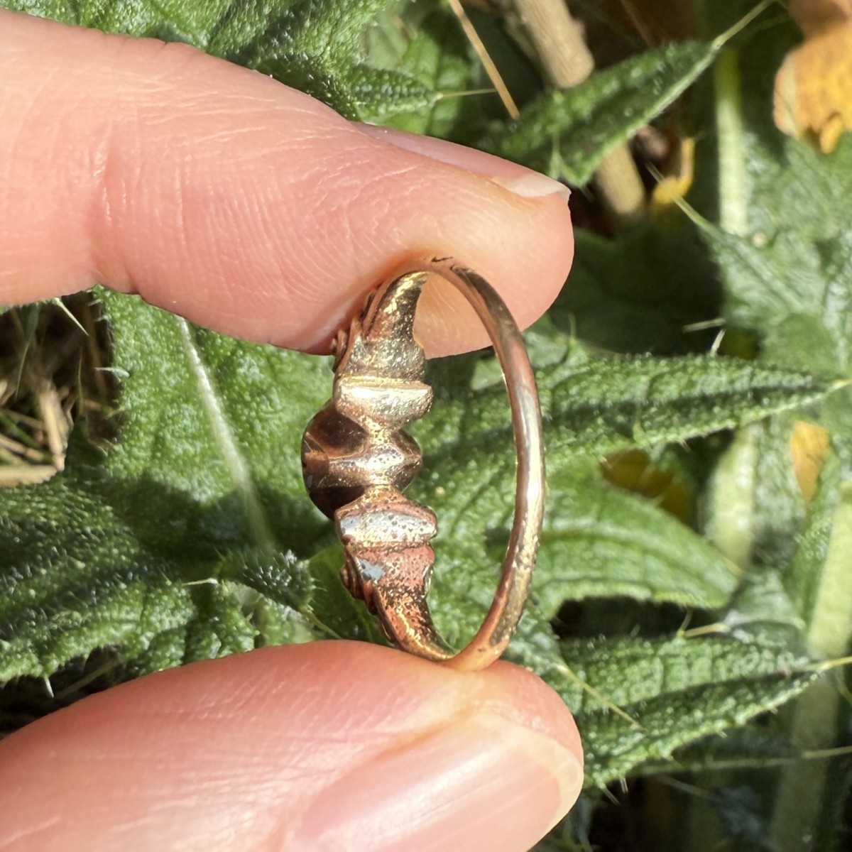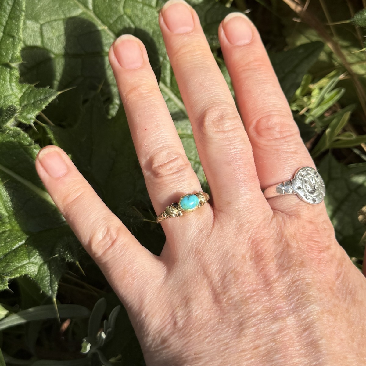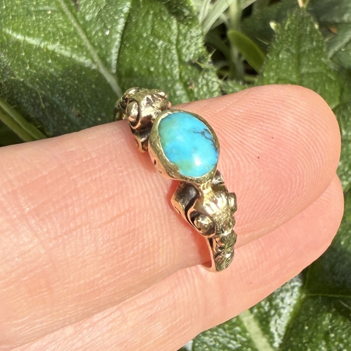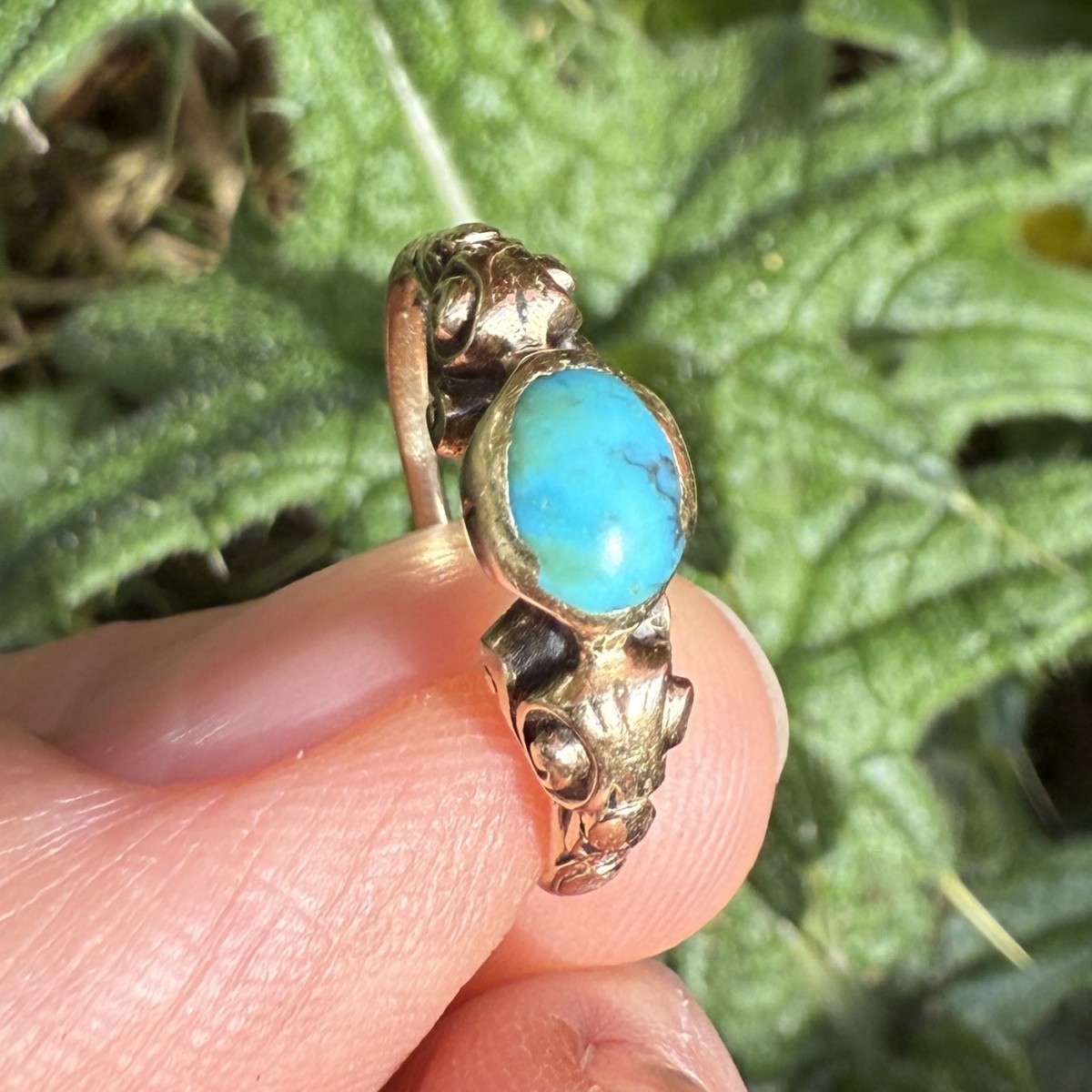 A Renaissance gold ring set with an oval cabochon turquoise in a plain collet bezel. The shoulders are ornamented with scrolling motifs and traces of original blue enamel. The ring is finely modelled and well worn, the turquoise showing natural inclusions typical of early stones.