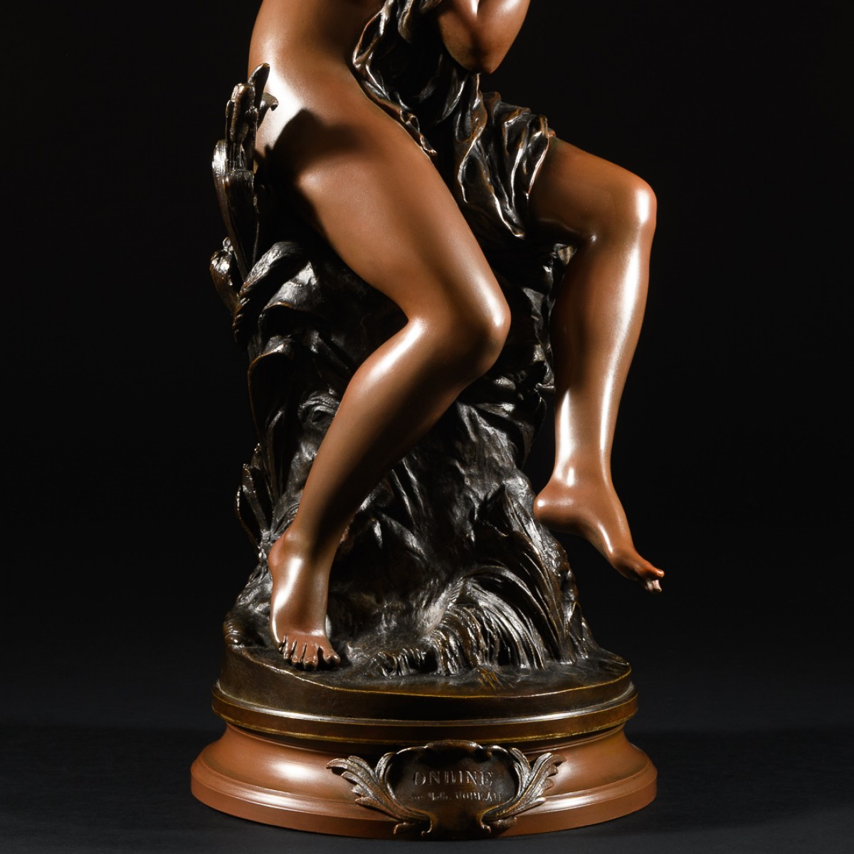 Executed with great finesse, this bronze exemplifies Moreau’s renowned mastery of movement, detail and feminine grace. The natural flow of the drapery and the delicacy of the features are modelled with exquisite precision. The sculpture retains its rich brown patina, beautifully preserved and lending the surface a warm, luminous depth. Signed “Math. Moreau” on the terrace, it stands on a rotating base with a front plaque inscribed: “Ondine / Par Math. MOREAU / Médaille d’Honneur.”