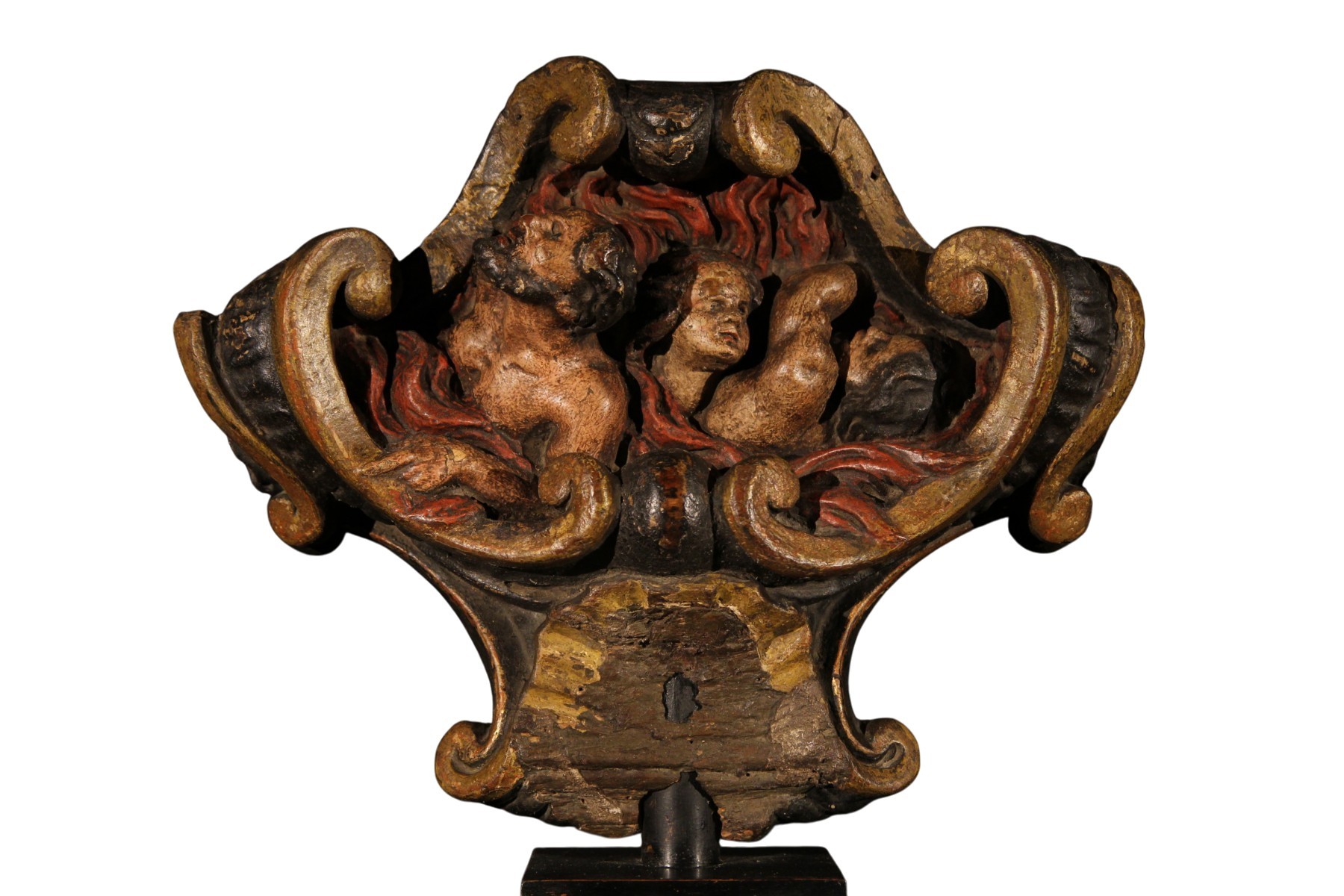 Top of a processional stick. Carved and polychrome wooden sculpture with the rare depiction of the deceased in the purifying flames of purgatory. Their eyes turned towards the sky express their hope for eternal salvation.