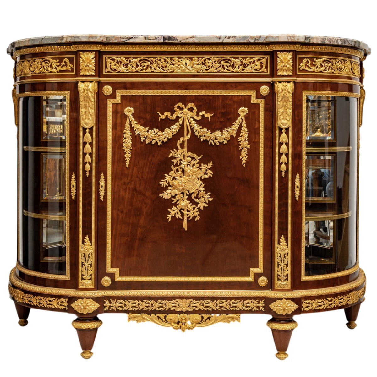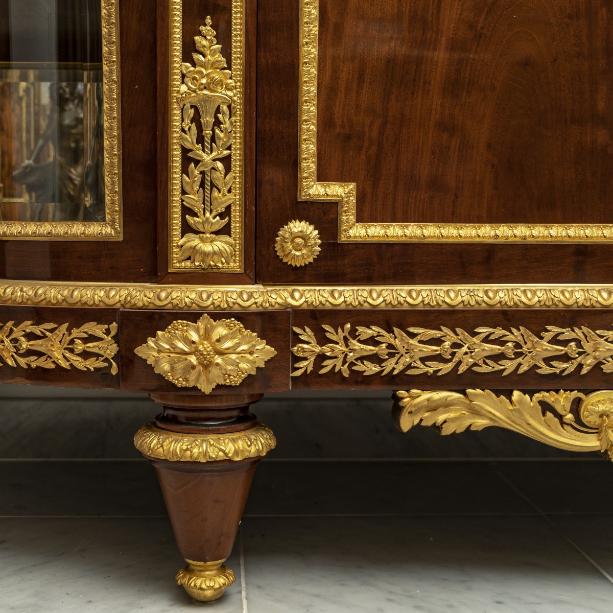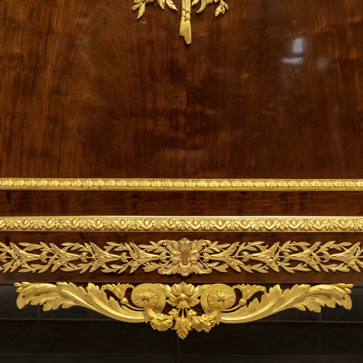 The façade, with curved ends, is organized around a central panel adorned with bronzes finely chased with remarkable care. Garlands of flowers, delicate ribbons, and leafy trophies stand out against the warm, silky background of the mottled mahogany, whose deep grain captures the light elegantly. The bronzes were gilded using the agate stone technique, a refined method that gives the gilding a soft, slightly satin glow, a distinctive mark of the finest pieces commissioned by 19th-century aristocratic clients.