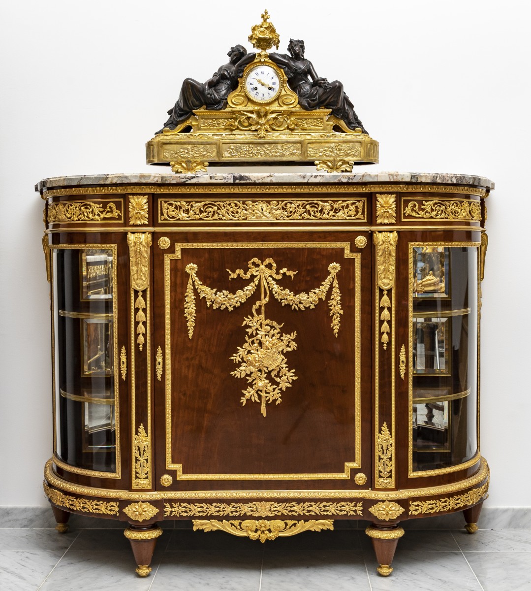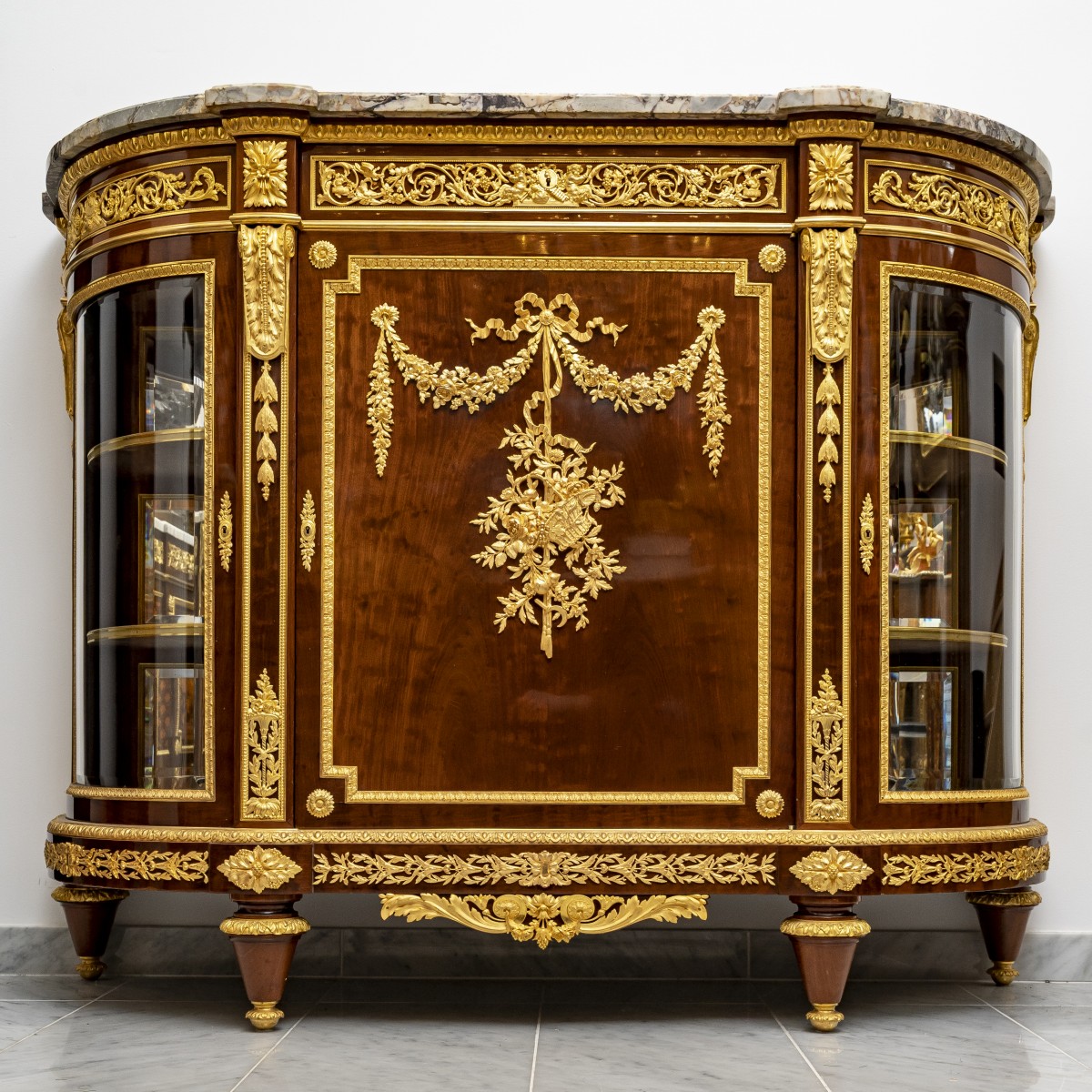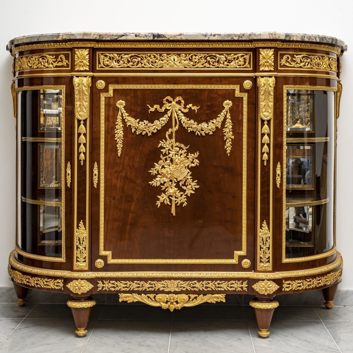 The façade, with curved ends, is organized around a central panel adorned with bronzes finely chased with remarkable care. Garlands of flowers, delicate ribbons, and leafy trophies stand out against the warm, silky background of the mottled mahogany, whose deep grain captures the light elegantly. The bronzes were gilded using the agate stone technique, a refined method that gives the gilding a soft, slightly satin glow, a distinctive mark of the finest pieces commissioned by 19th-century aristocratic clients.