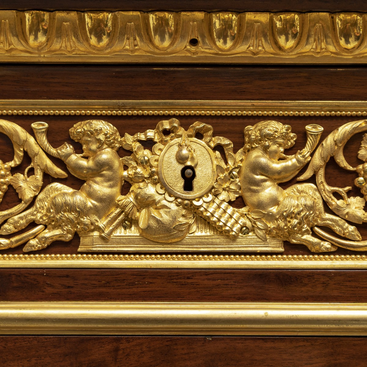 Above the central door, a drawer is decorated with finely chased bronzes, featuring squirrels, eagles, and cherubs playing music.