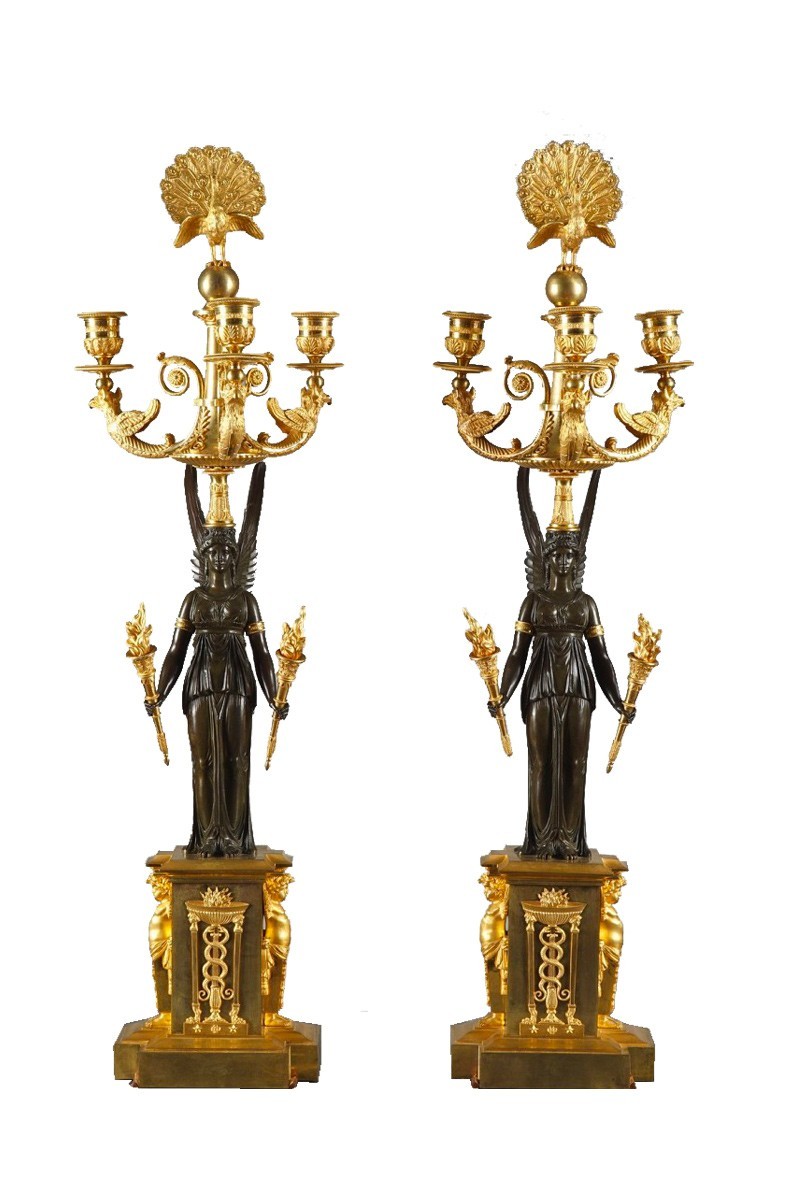 An important pair of gilt and chiselled bronze three-light candelabra decorated with griffons and rosette, the patinated bronze stem adorned with winged Victory holding ormolu torches. The set is topped by a peacock on a globe, solar symbol and sign of immortality. Cruciform base decorated with caduceus, two interlaced snakes and winged putti. Attribute of Mercury or Hermes in Antiquity, the caduceus is the symbol of peace, eloquence and trade. Empire period. Very good condition.