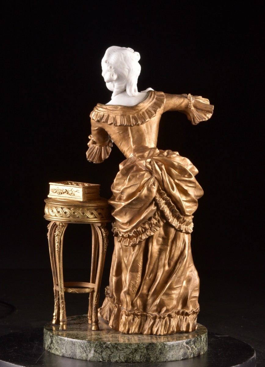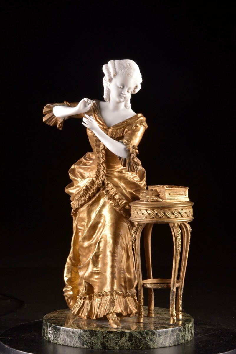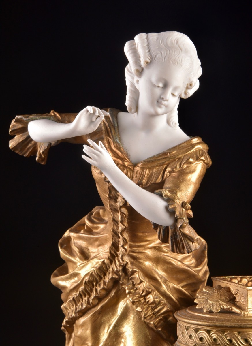 Charming sculpture representing a young woman at her toilette, delicately adjusting a ribbon. The face and arms in white biscuit contrast with the richly pleated gilt metal dress. Placed on a circular marble base. Signed Grisard, sculptor active in Paris during the Second Empire, known for his refined compositions in biscuit and gilt bronze. A fine example of the elegance of 19th century French decorative art.