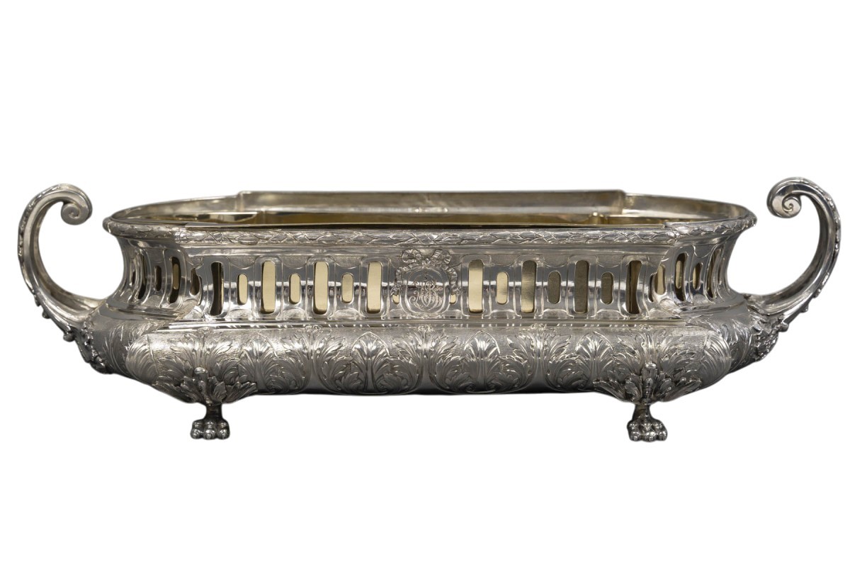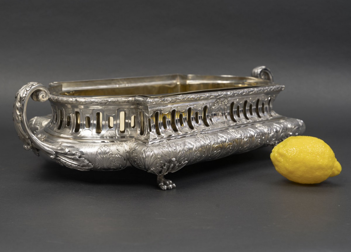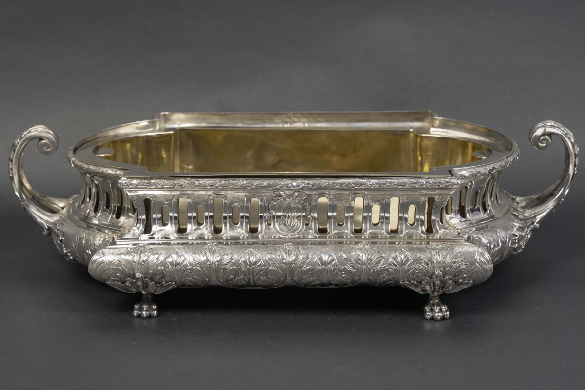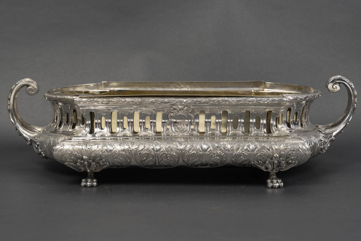 Impressive rectangular planter resting on four feet in the shape of stylized acanthus leaves ending in balls. The domed body is richly chiseled with palmettes, gadroons, and raised foliage motifs. The openwork upper section alternates rectangular openings and vertical uprights, topped with a finely engraved laurel frieze. The scrolled, foliage-covered side handles harmoniously frame the ensemble.